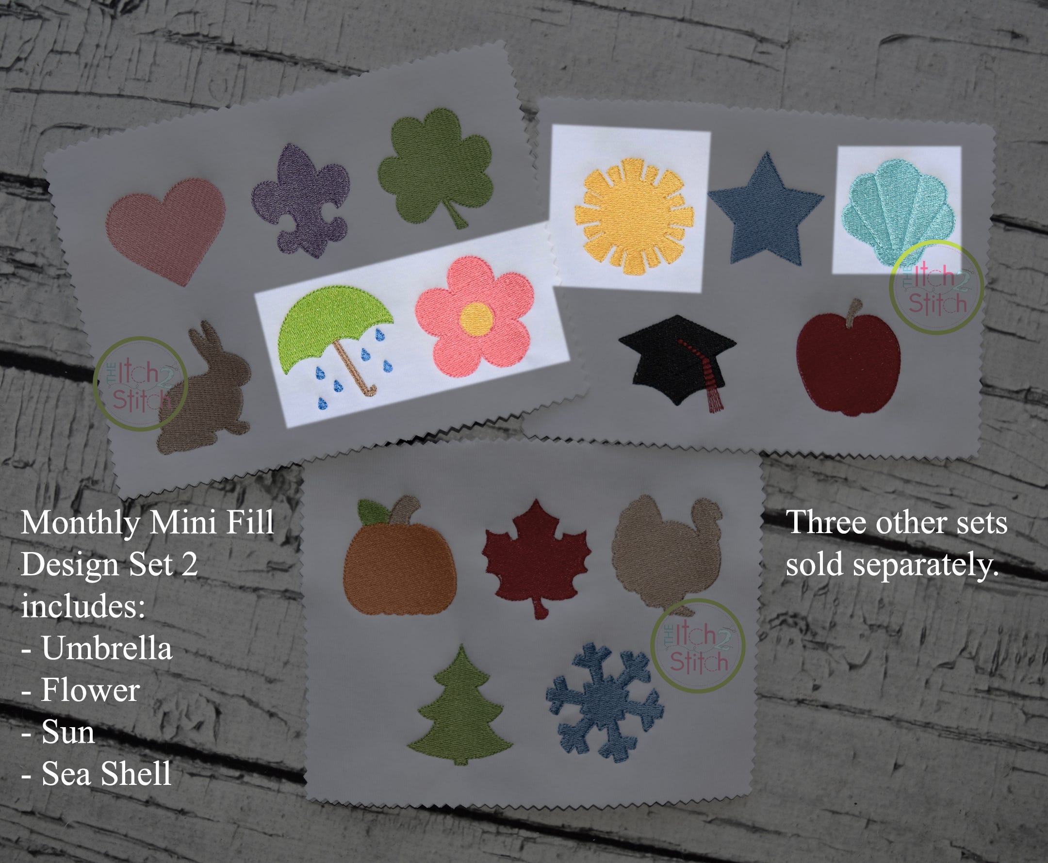 This set includes 4 different designs: Mini Umbrella Fill, Mini Sun Fill, Mini Shell Fill, Mini Flower Fill.