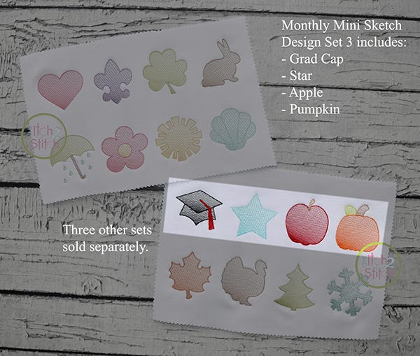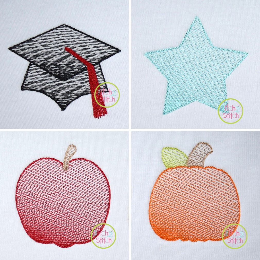 This set includes 4 different designs: Mini Grad Cap Sketch, Mini Apple Sketch, Mini Pumpkin Sketch and Mini Star Sketch. Also available in filled (See below)