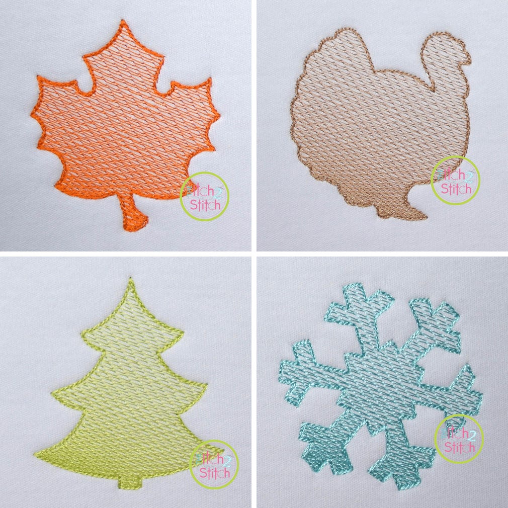 Please note this is not applique, nor is it a traditional fill stitch design. The light and airy "sketch" fill pattern allows for a quick stitch out. The space between each line of stitching varies such that it is more dense at one side of an object than the other to create the shading effect. Each object is finished off with a triple bean stitch outline. We do not recommend resizing this design in software.