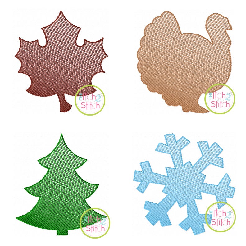 This set includes 4 different designs: Mini Leaf Sketch, Mini Turkey Sketch, Mini Tree Sketch and Mini Snowflake Sketch.