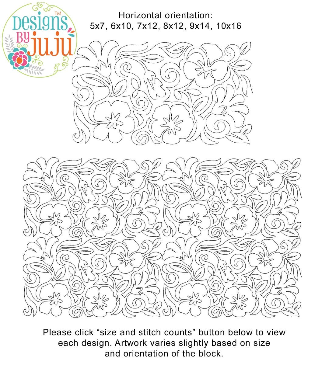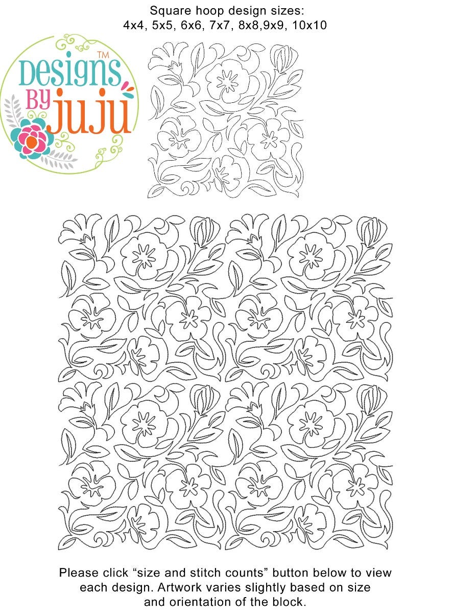 Please note: Both the scale of each pattern and arrangement of the motifs may vary based on the hoop size. Please click the "Size and Stitch Count" button to view the artwork for each size.