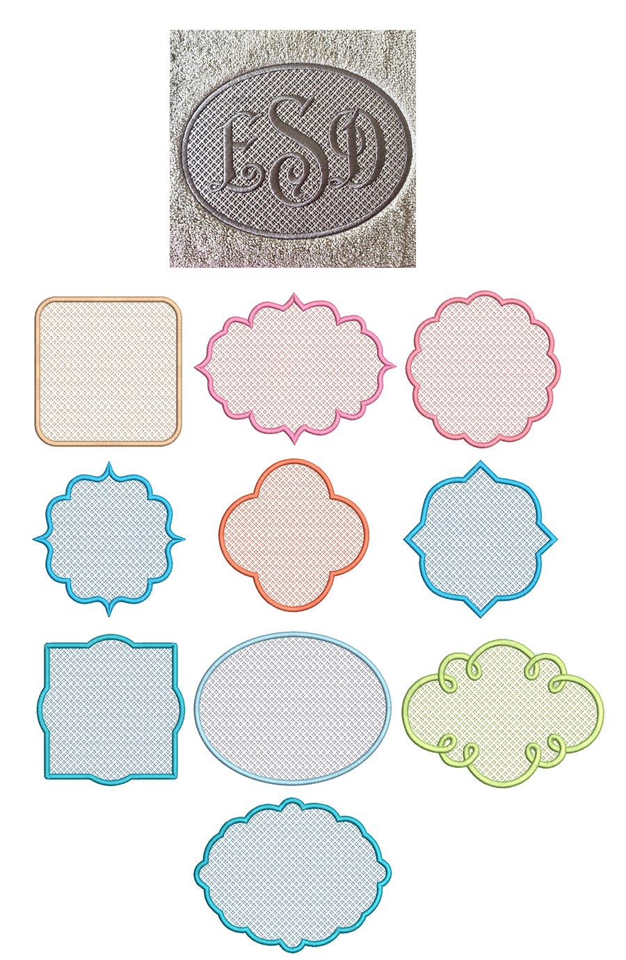 We took our frames from our Monogram Applique Frames sets and created them with a simple motif fill to act as a "knockdown" or embossing feature for items with a high pile or nap such as towels, fleece, sherpa etc. **fonts and monograms not included with these sets.