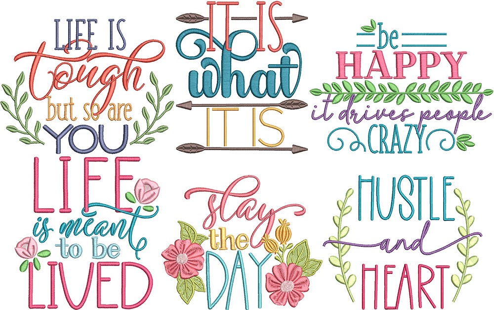 4 more motivational and inspiring word art designs! These embroidery-only designs feature satin stitch lettering with satin and fill stitch design elements.