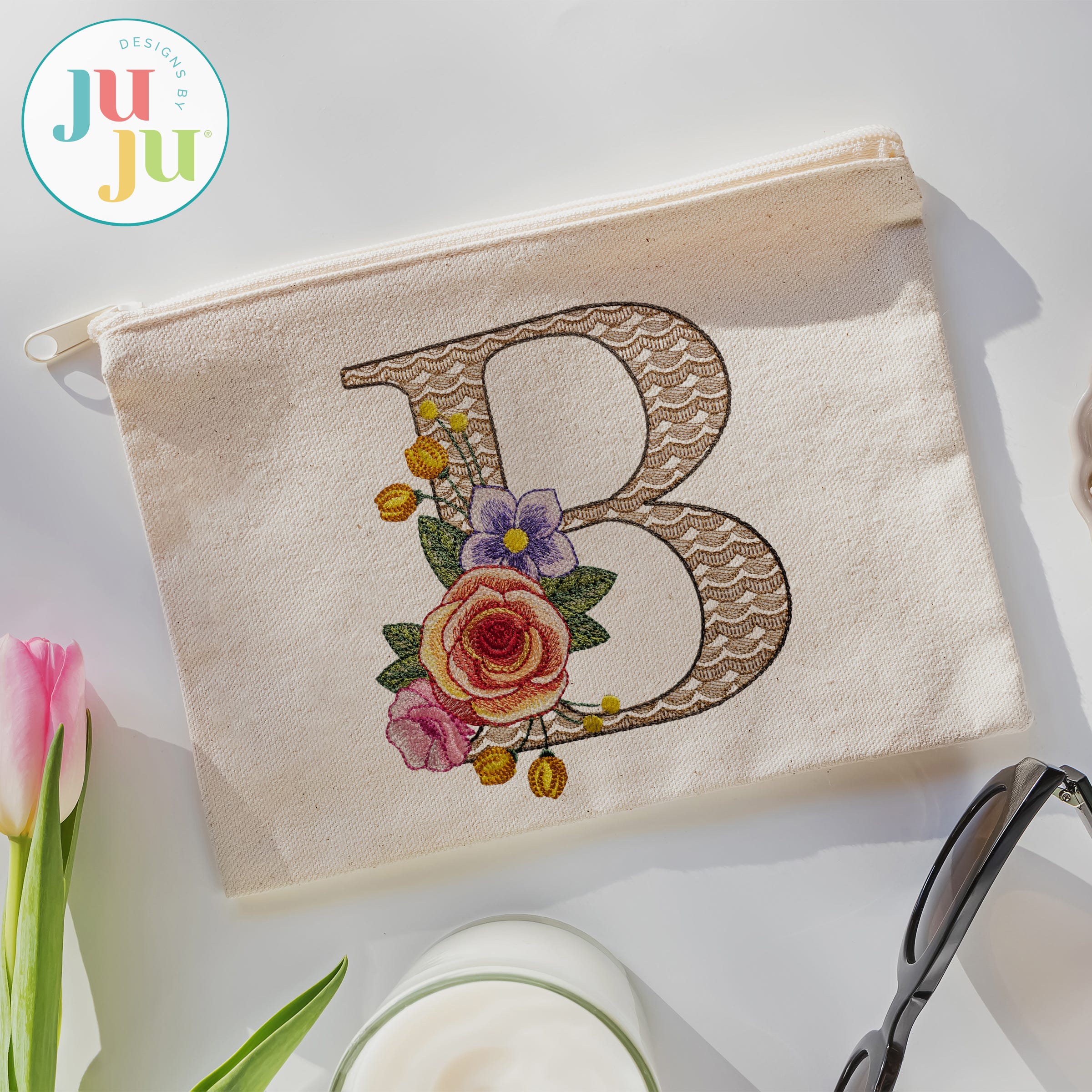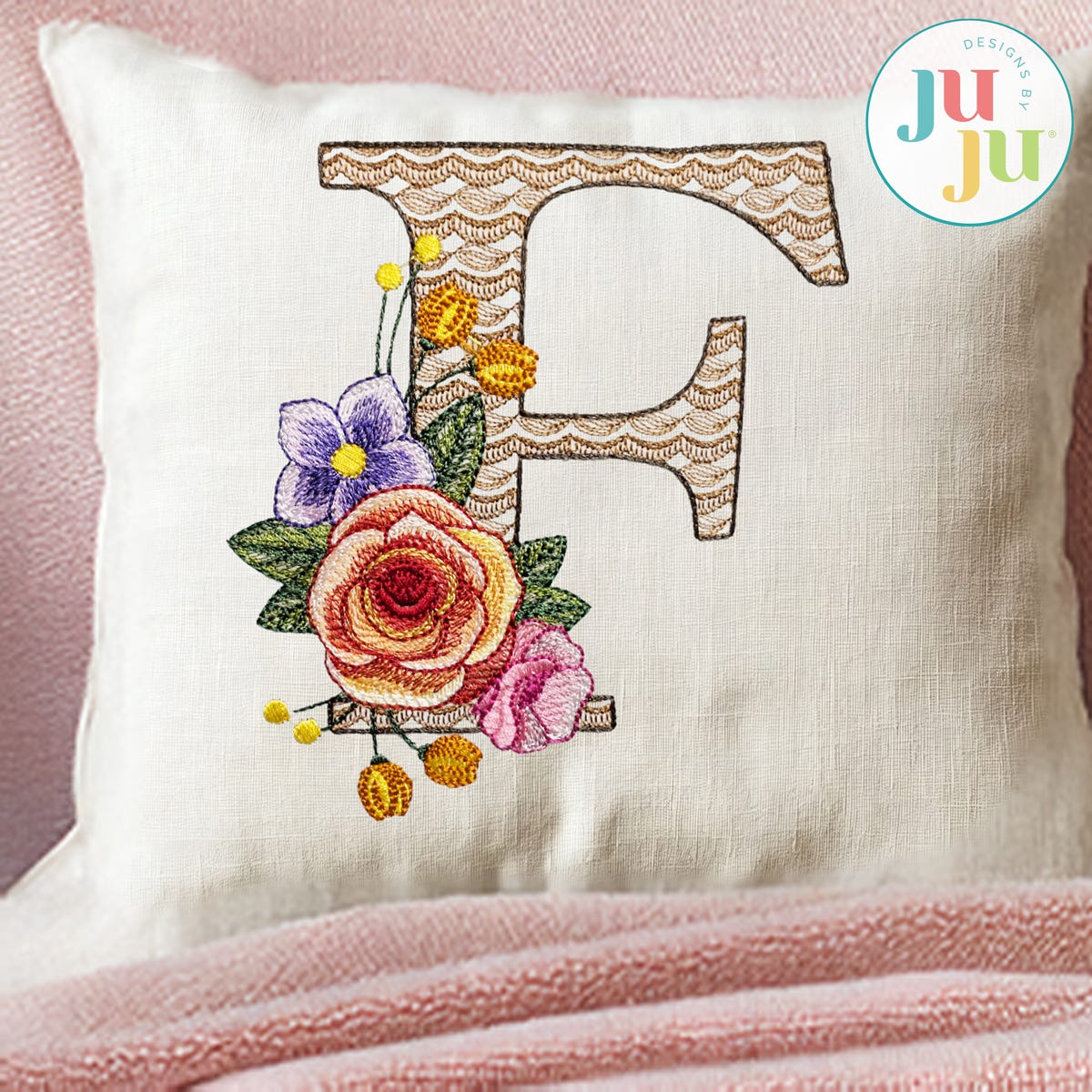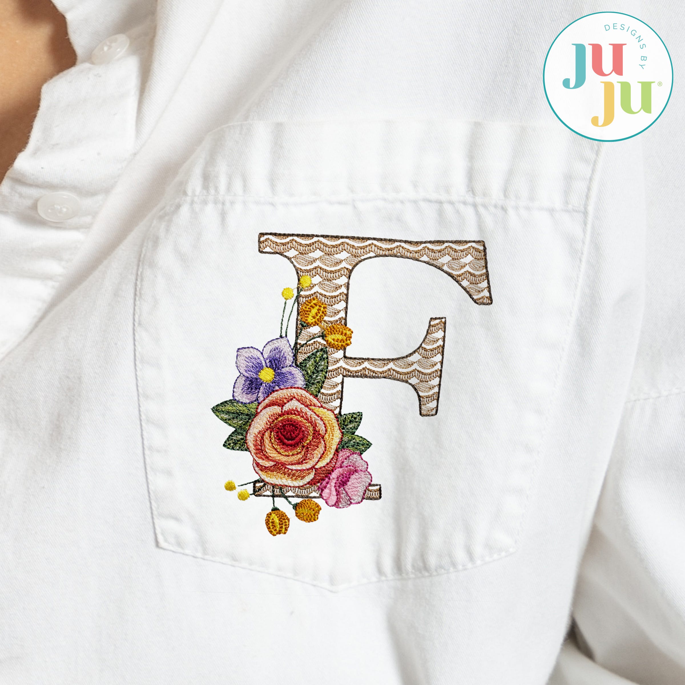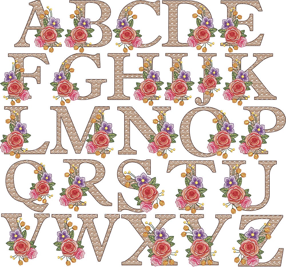 The motif fill stitch letter is topped with embroidered flowers. The flowers feature multiple color layers of lighter density fill to create a blended, variegated, textured look.
