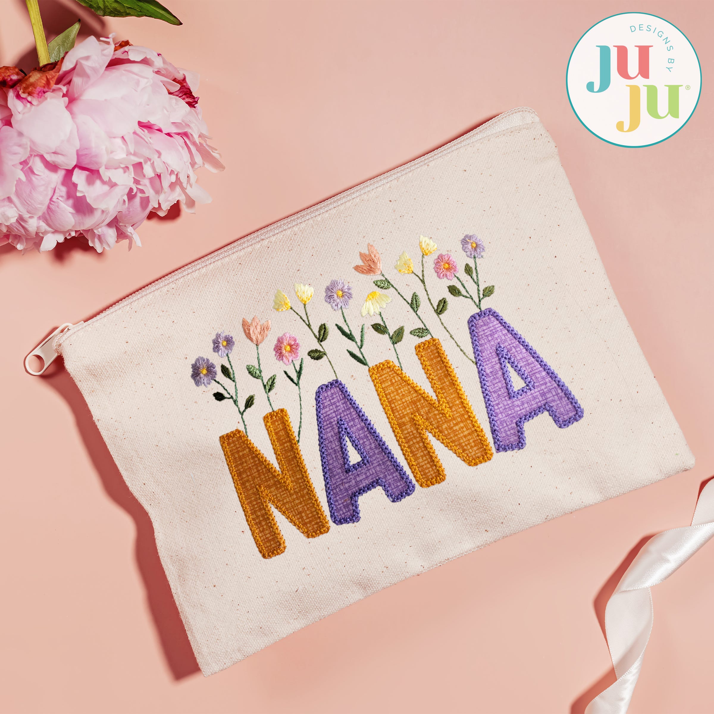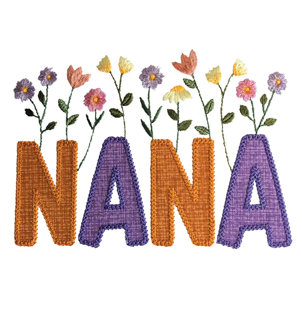 The name "Nana" is beautifully accented with delicate floral details in this Heirloom Garden Applique design. The flowers showcase a blend of fill and bean stitch styles. The name is included in the design as shown, and features applique letters finished with a decorative chainstitch.