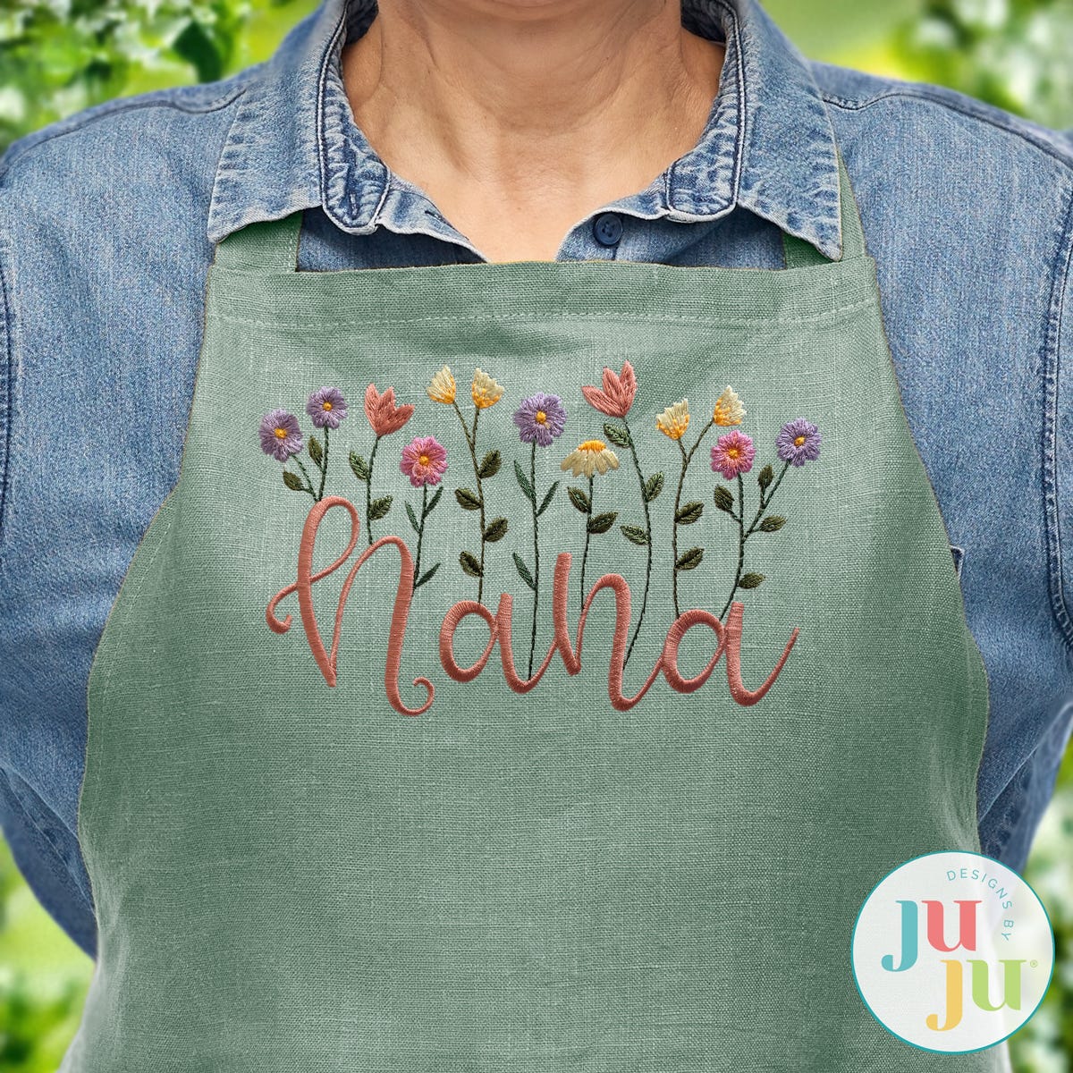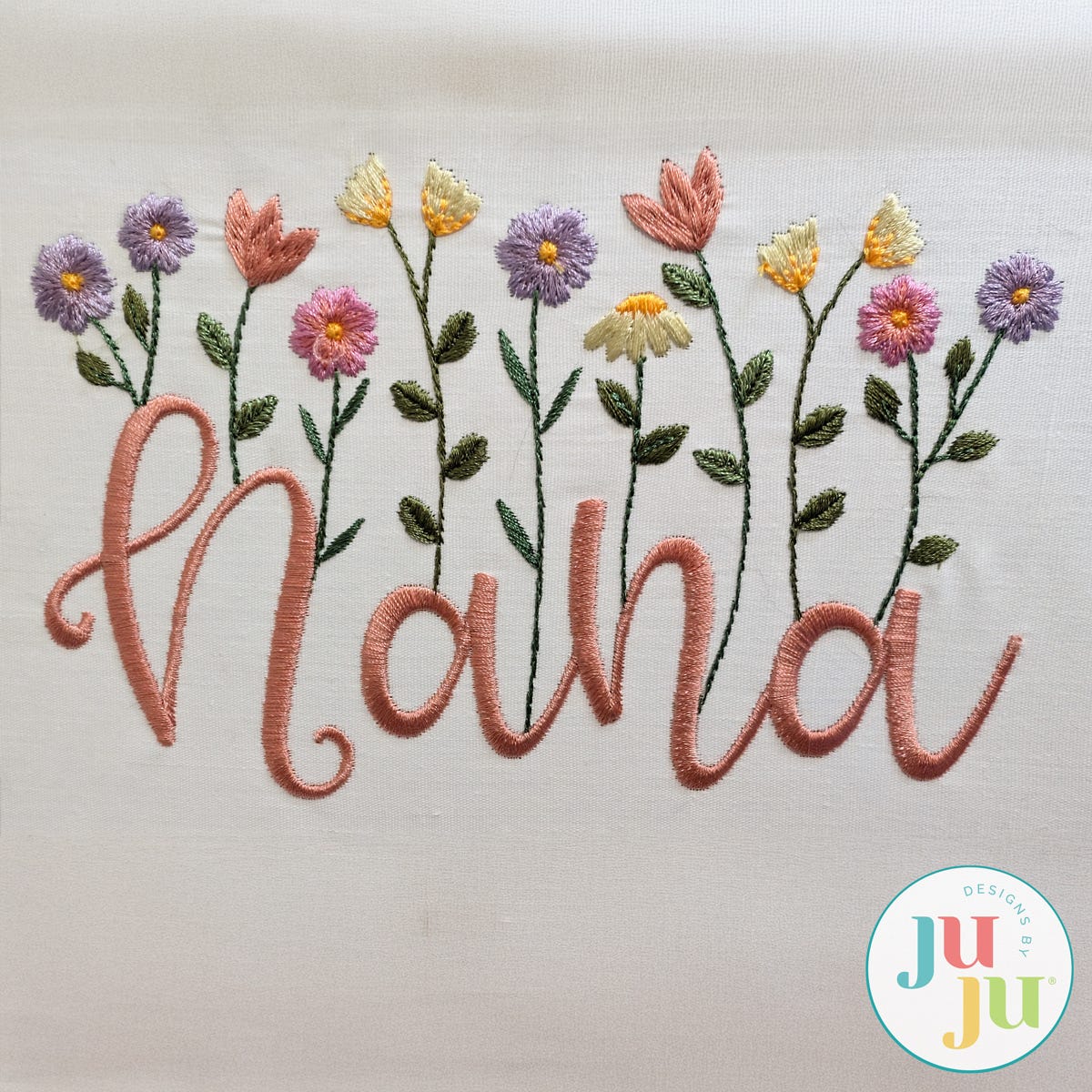 The name "Nana" is beautifully accented with delicate floral details in this embroidery-only design. A blend of satin and bean stitches are combined to create flowers that gracefully bloom from the lettering.