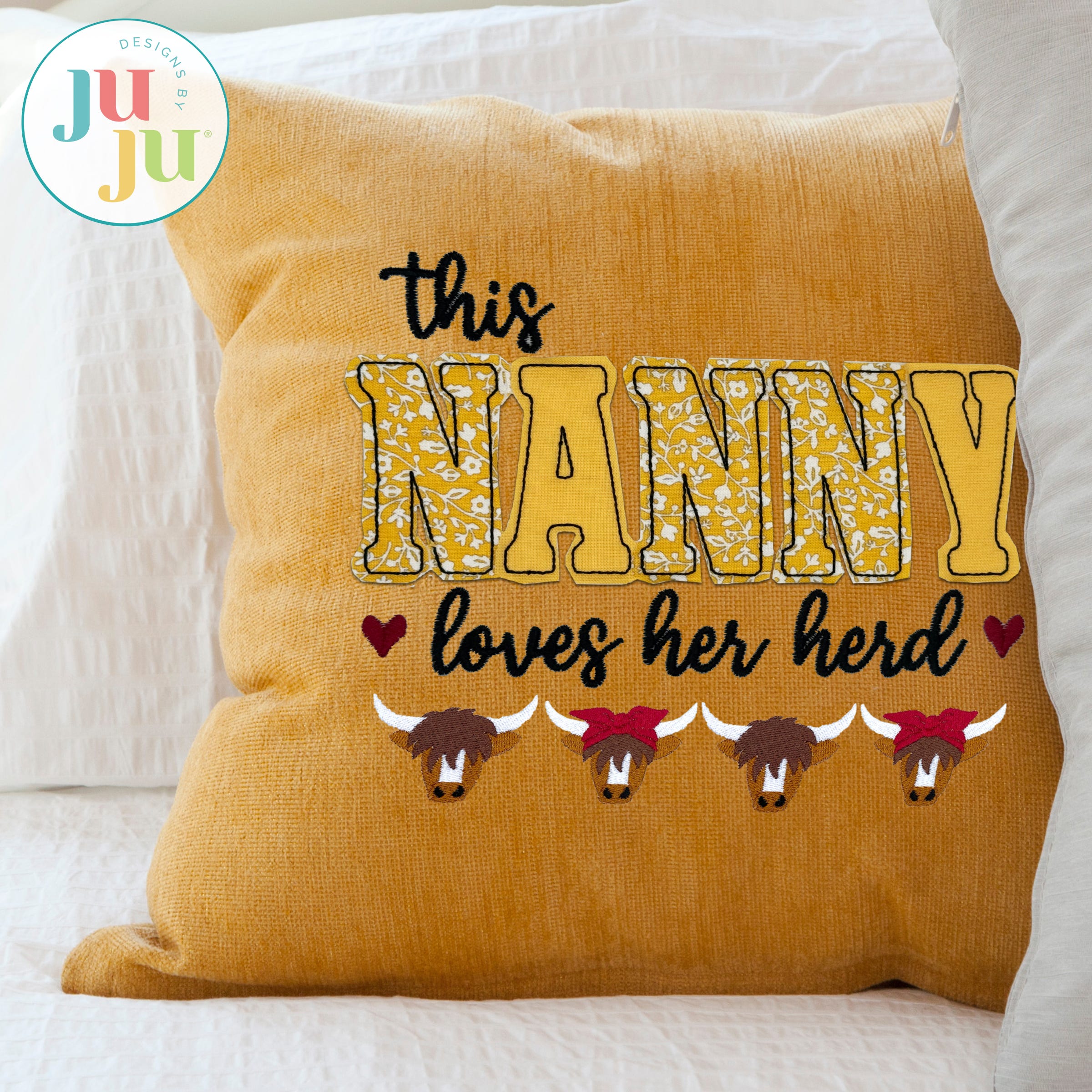 This Nanny Loves Her Herd! The design set includes one applique in four sizes (4x4, 5x7, 6x10 and 8x8), plus two fill stitch Mini Highland Cows that can be used to customize your project. Add the number of boy and/or girl minis to represent your herd. Place them under the applique design or on the sleeve of a shirt; personalize with the font of your choice!