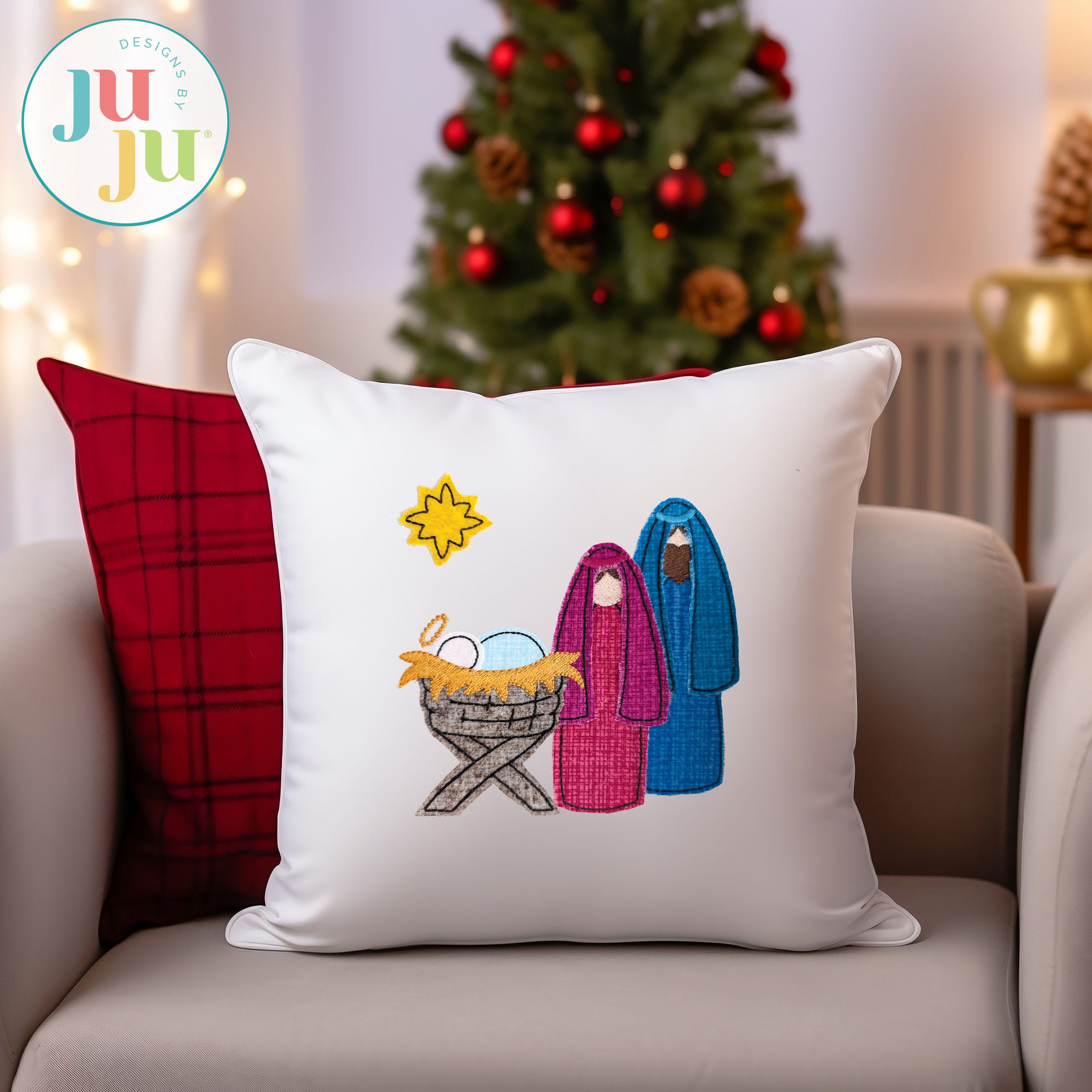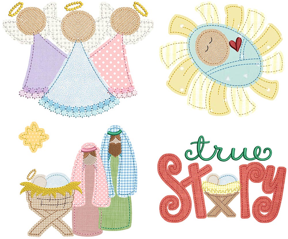 Celebrate the true reason for the season with Nativity Christmas bean stitch applique designs! This set of four includes an angel trio, baby Jesus, the holy family, and a "true story" text design. All embroidered text ("true") is included in the design file as pictured. Four sizes included (4x4, 5x7, 6x10 and 8x8).