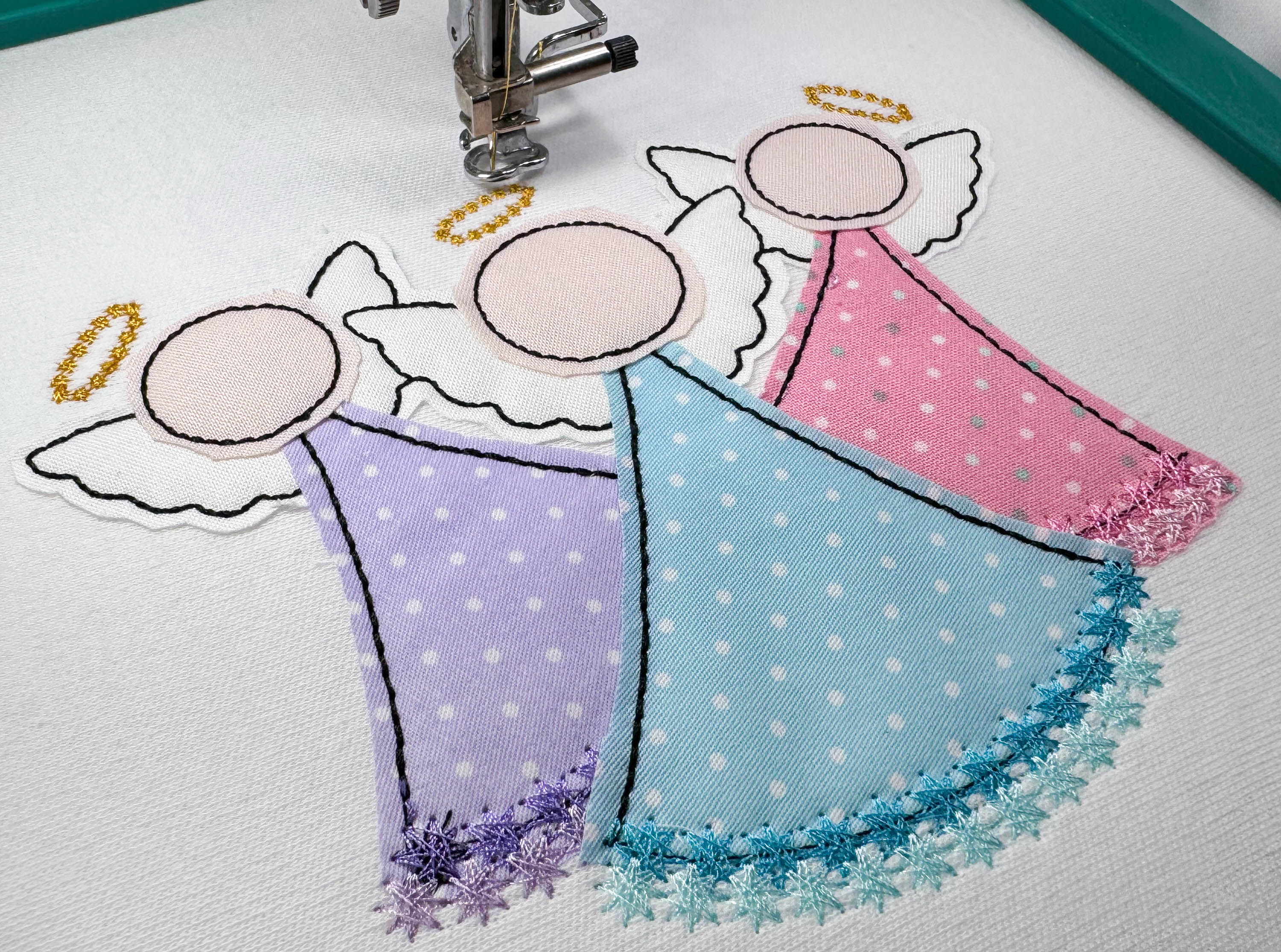For the applique parts of these designs each fabric has only two colorstops: a single running stitch placement step, and bean stitch step that serves as both the tackdown and finishing stitch. We recommend using a fusible product on the applique fabrics and neatly trimming 1/8" outside the bean stitch for a polished look. We love the results when using black embroidery thread for all the bean stitch outlines!
