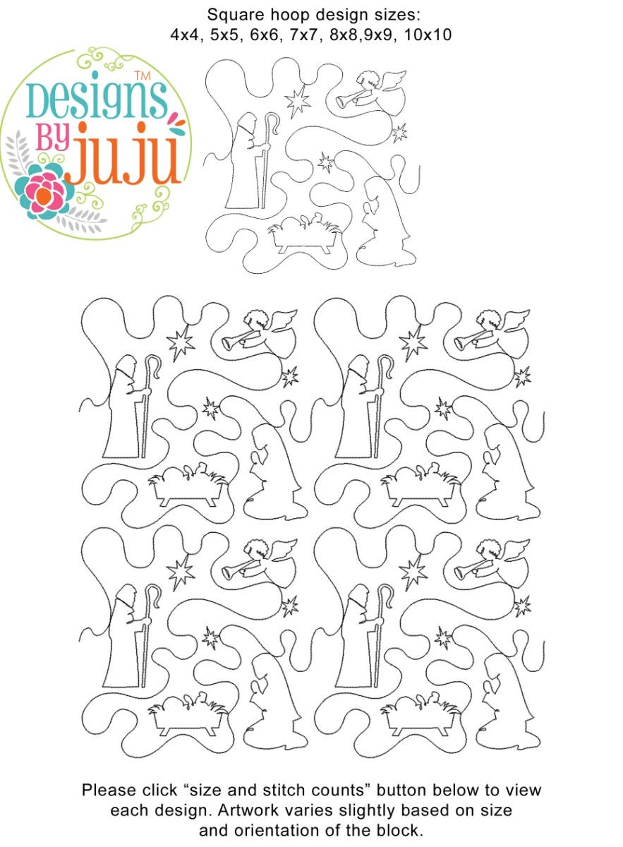 Please note: Both the scale of each pattern and arrangement of the motifs may vary based on the hoop size. Please click the "Size and Stitch Count" button to view the artwork for each size.