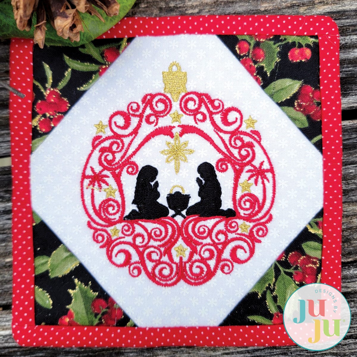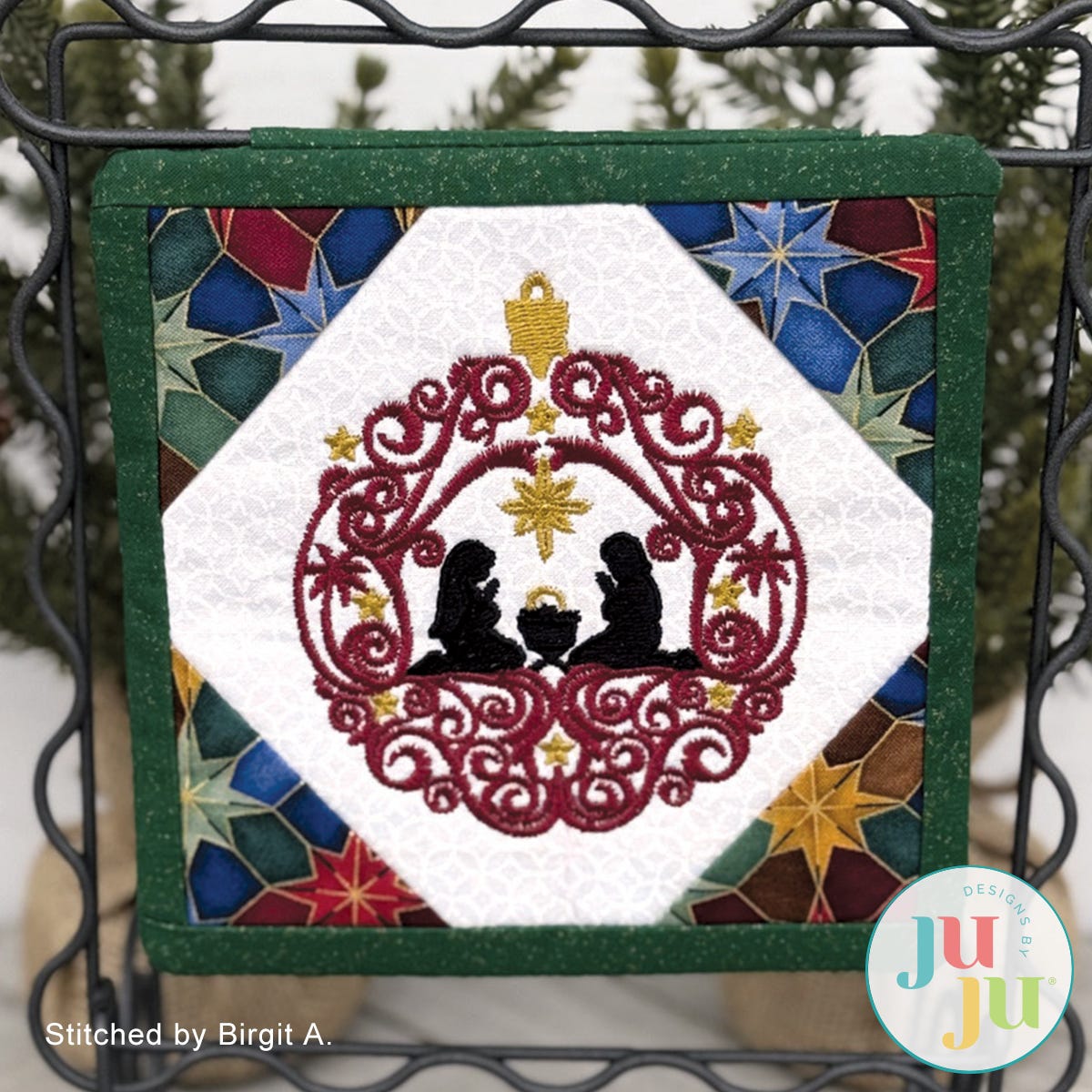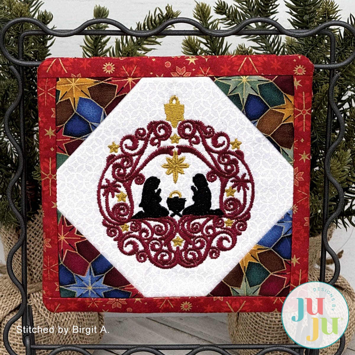 This tiny Christmas quilt is entirely stitched in the hoop. No additional hand or sewing machine stitching required. Thorough and detailed instructions as well as many photos will guide you through the process of making this project.