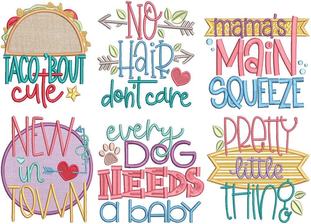*Please note that the following designs contain applique components: Taco Bout Cute / Mama's main squeeze / Pretty little thing / New in town /Ā