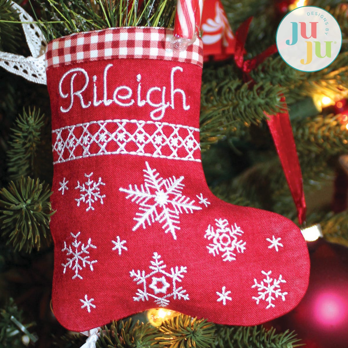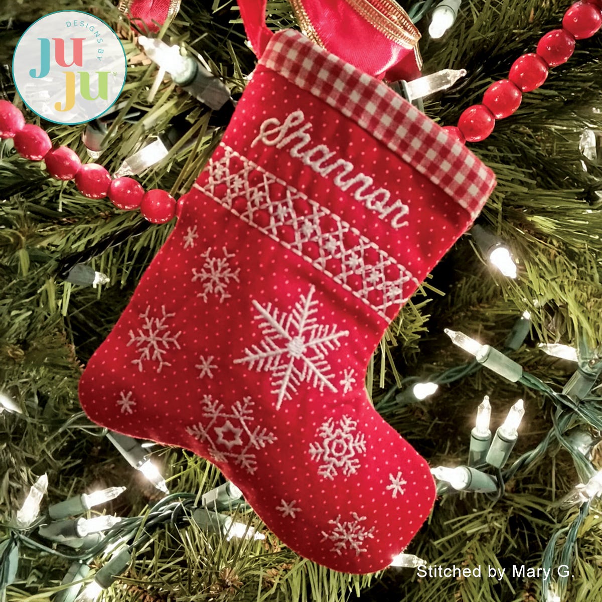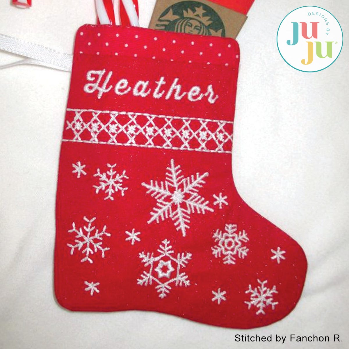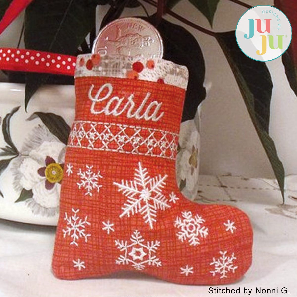 This quick last minute project is completed in the 5x7 hoop. A small amount of machine sewing is optional. The little stocking is fully lined; no seams, no raw edges visible. Perfect for filling with candy canes, mints, chocolates, all sorts of goodies (including gift cards). Hang it from your Christmas tree. Also good as place card for your Christmas dinner table. Only one hooping is required.