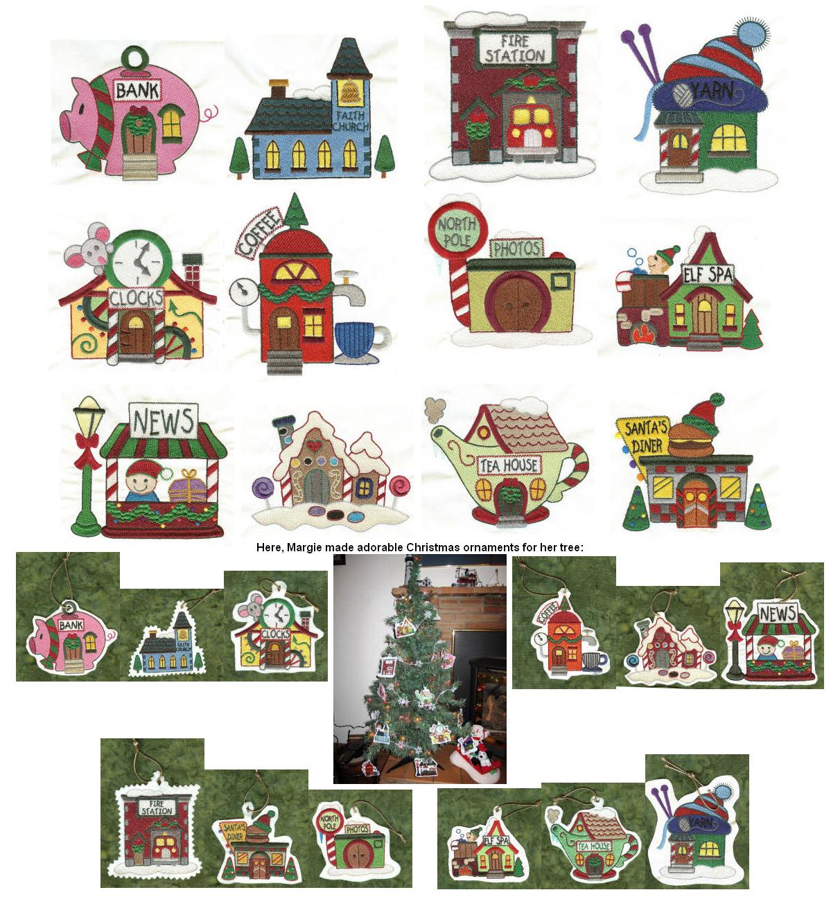 It has finally arrived! Here, in a filled version, is set 3 of our North Pole Village series. Available in both 4x4 and 5x7, you will have a blast adding these adorable, whimsical houses to our other collections to create a delightful Christmas fantasy land to any number of projects. Below, my tester Margie made adorable Christmas ornaments out of the small size by sewing them out and adhering them to Timtex.