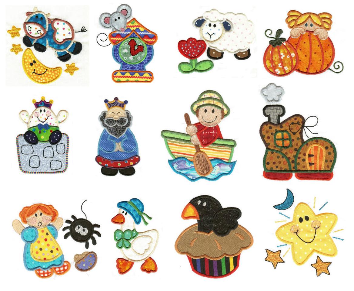 12 adorable nursery rhymes in applique! Perfect for nursery decor, clothing, quilts, cloth books and more. Would make a perfect gift!!