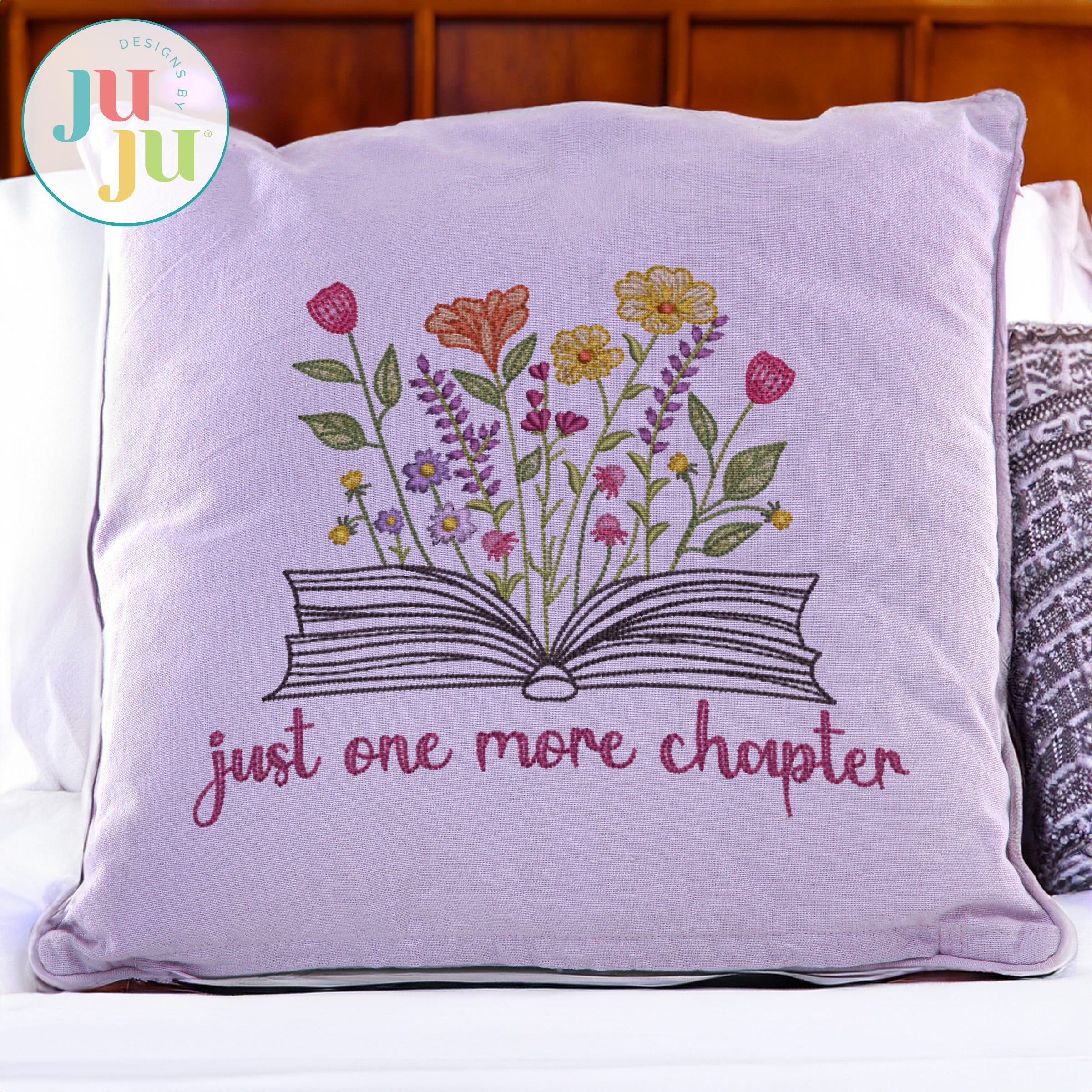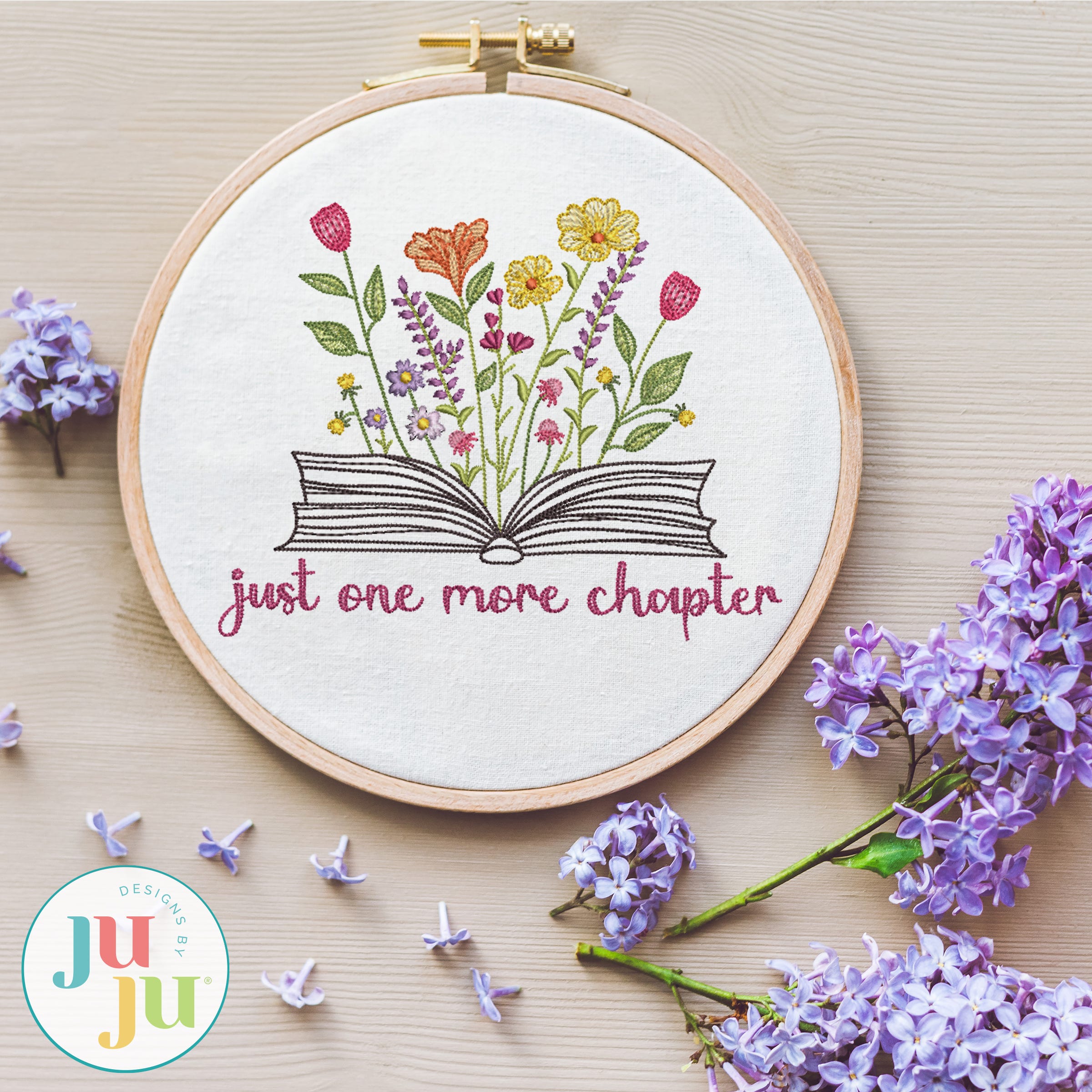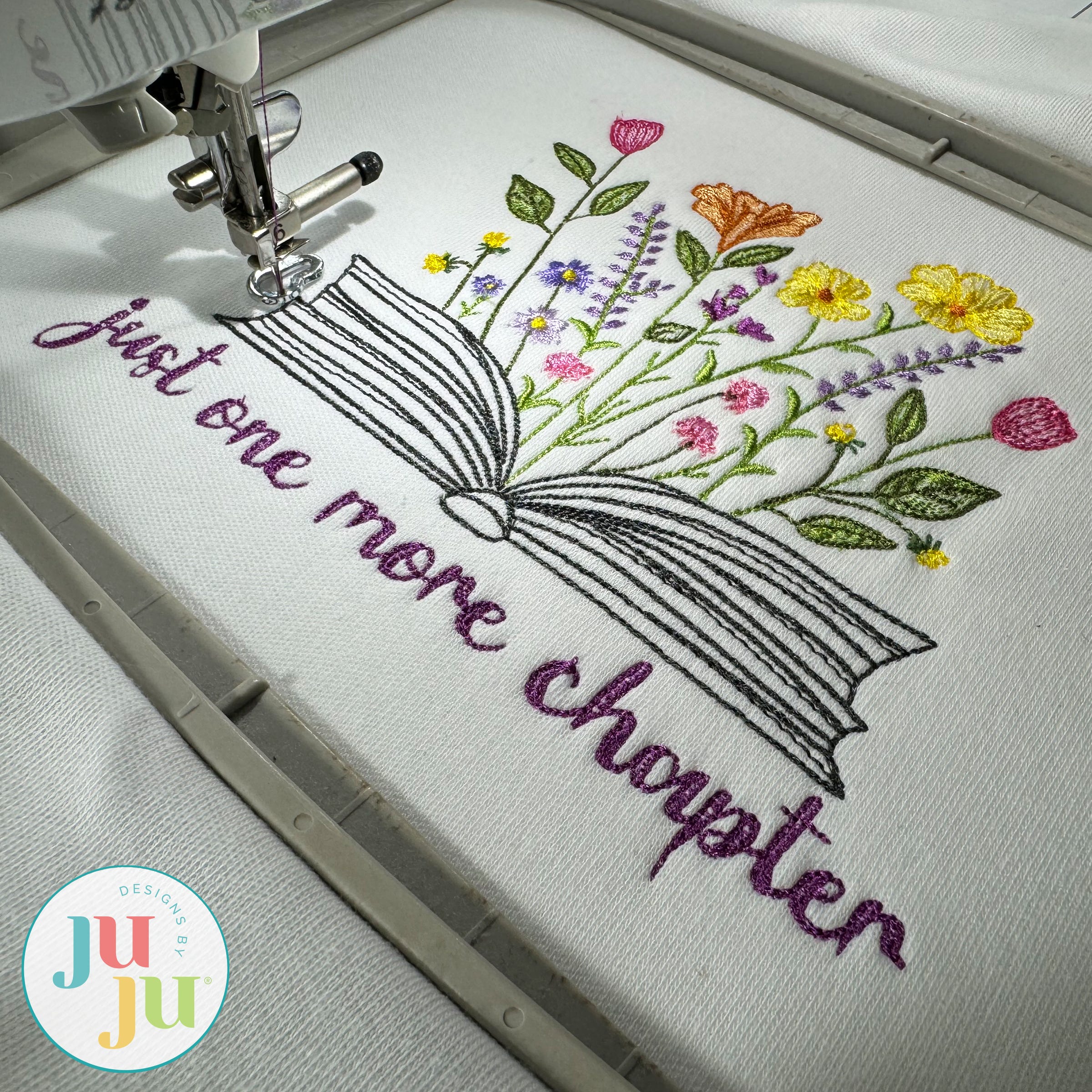 Just one more chapter... This single embroidery-only design features sketch fill and satin stitch flowers blooming out of a bean stitch book. The bean stitch lettering is included in the design file, as pictured.