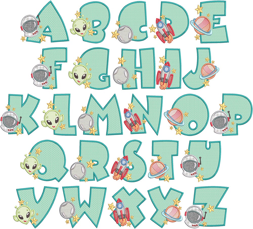 Make out-of-this-world projects with our Outer Space Applique Alphabet! The applique letters have a satin stitch outline and include applique space-themed elements with embroidered stars. The Saturn planet on letters E, J, O, T and Y has sketch fill details.