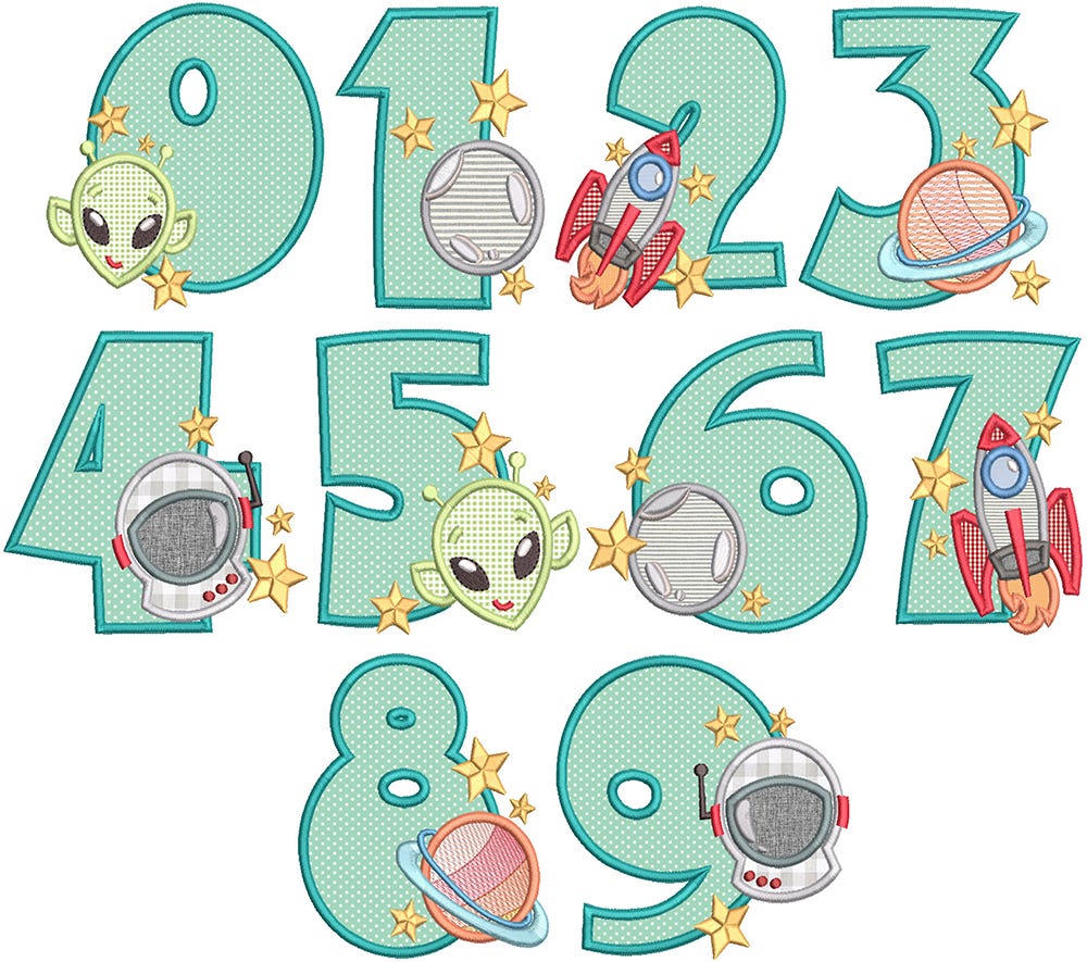 Count down to blast off with our Outer Space Applique Numbers! The applique numbers have a satin stitch outline andĀ include applique space-themed elements with embroidered stars. The Saturn planet on numbers 3 and 8 has sketch fillĀ details.