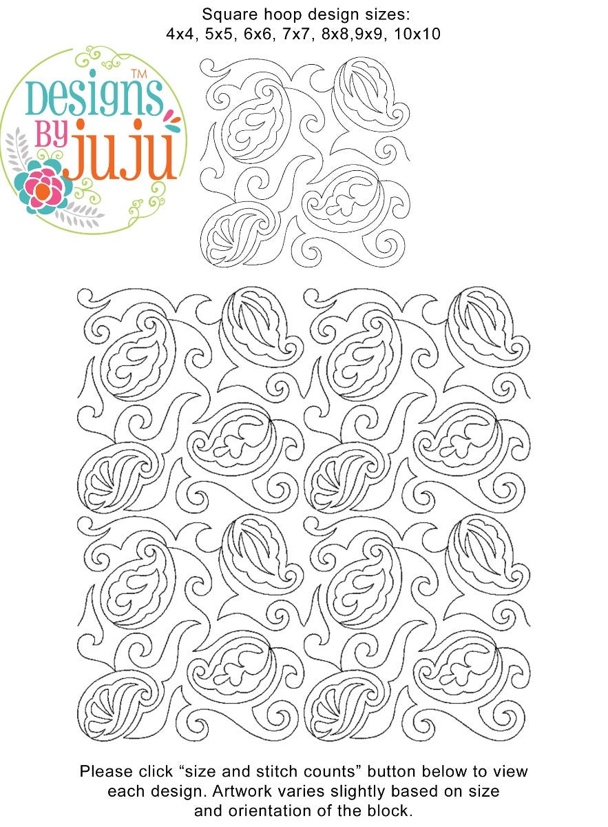 Please note: Both the scale of each pattern and arrangement of the motifs may vary based on the hoop size. Please click the "Size and Stitch Count" button to view the artwork for each size.