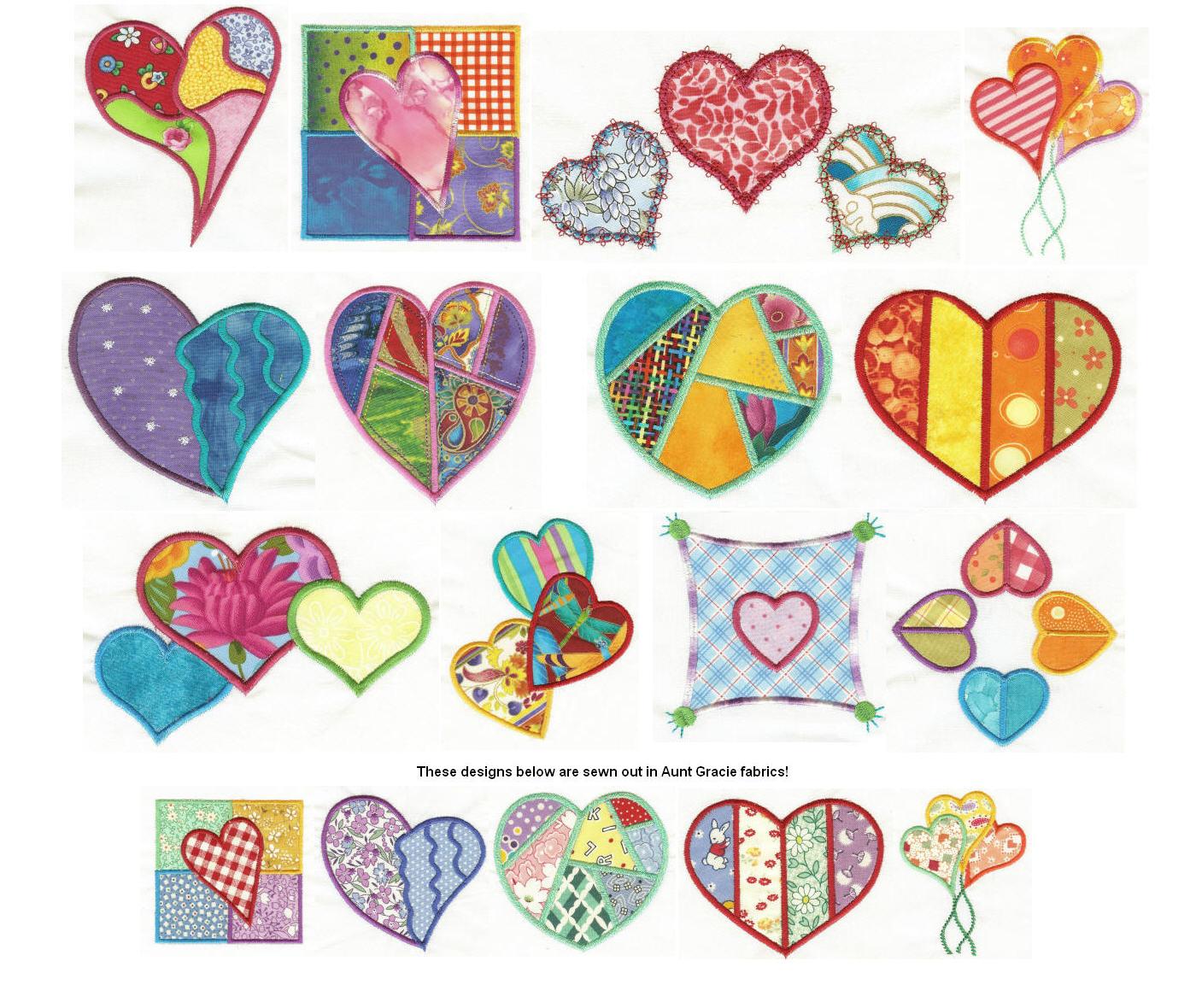 Just in time for Valentine's Day, we have a beautiful set of patchwork hearts! These are not just for Valentine's Day, but are very versatile and great for loads of projects! Shown at the bottom of the page are a few of them also sewn out in Aunt Gracie fabrics and ooh sew cute!