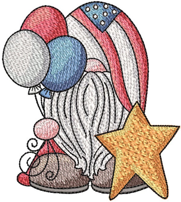 Celebrate independence with this gnome holding balloons! 4x4 and 5x7 hoop sizes included. This single design features multiple color layers of lighter density fill to create a blended, variegated, textured look.