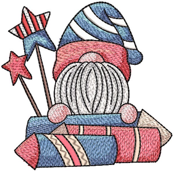 This patriotic gnome is ready to light the fireworks to end the celebration with a bang! 4x4 and 5x7 hoop sizes included.