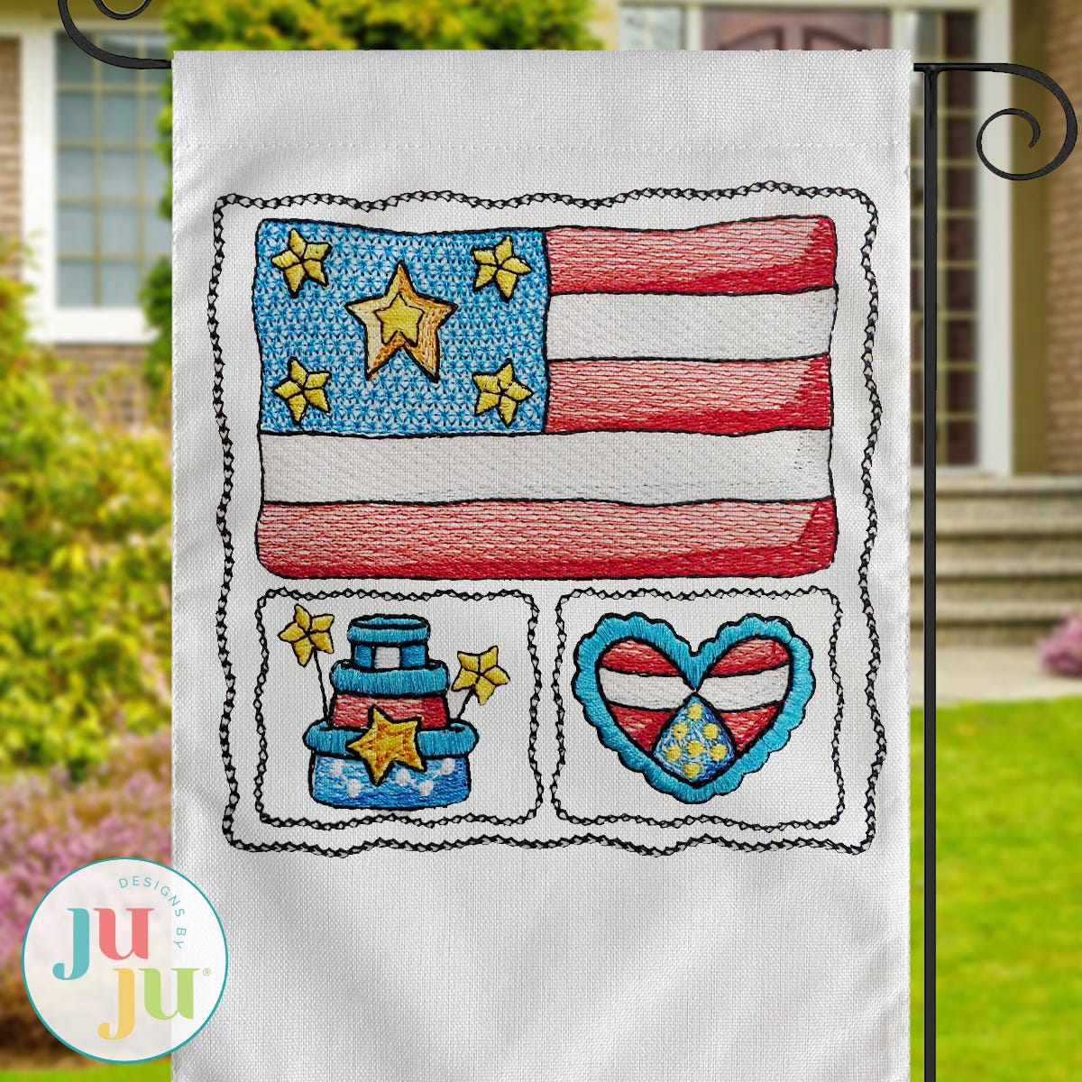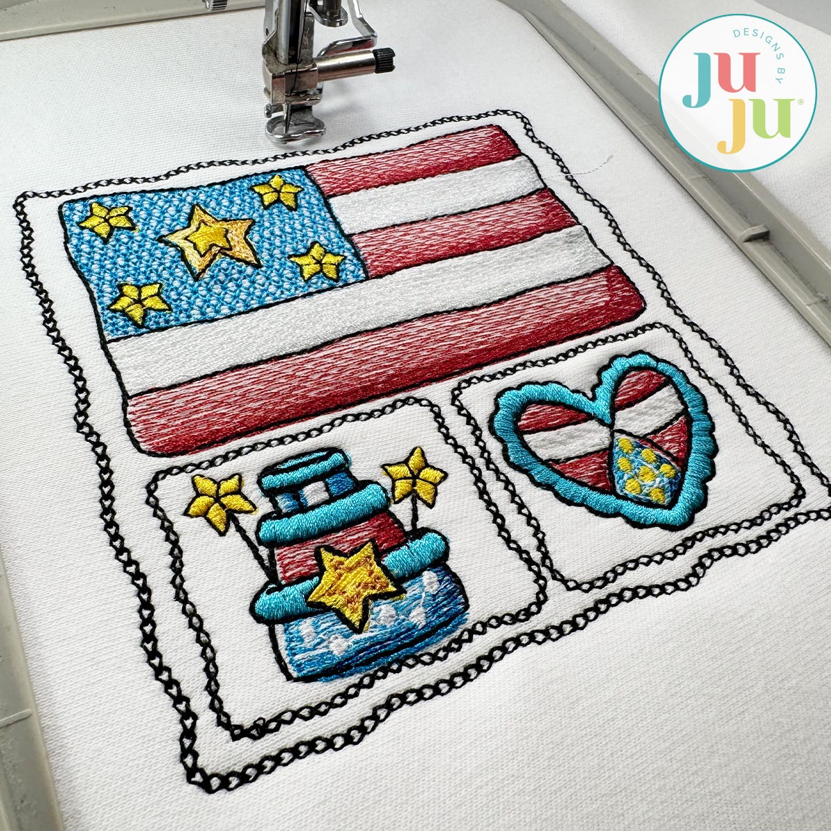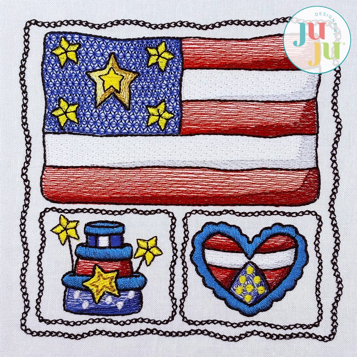 Celebrate the red, white, and blue with this charming Patriotic Scenes Flag embroidery design! This design features stylish patriotic icons such as a flag, heart, stars, and more in a variety of embroidery stitch types.
