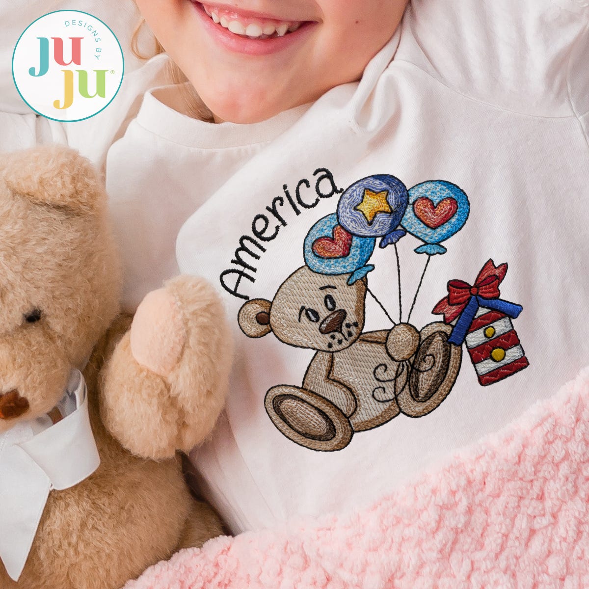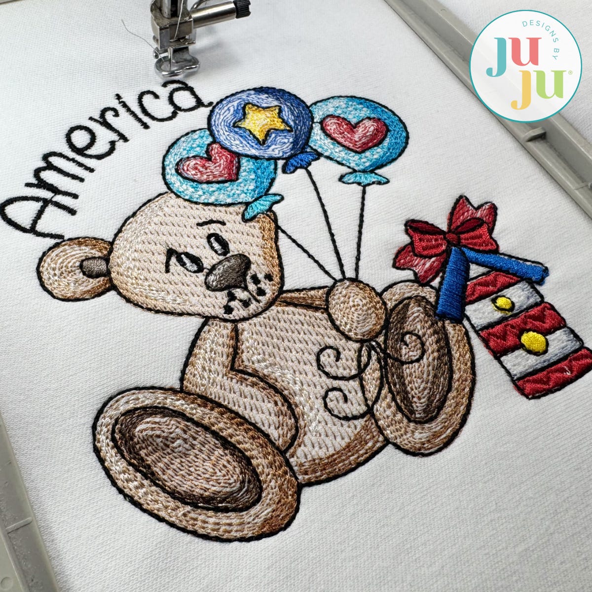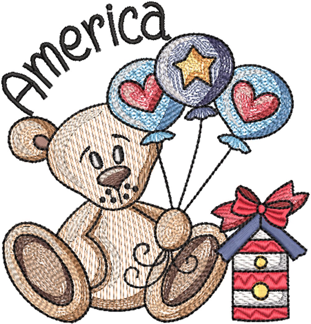 Celebrate the red, white, and blue with a whimsical twist! Our Patriotic Scenes Teddy Bear embroidery design features teddy holding three festive balloons and sitting next to an adorable Americana style birdhouse adorned with a bow. The word "America" finishes off the scene perfectly.