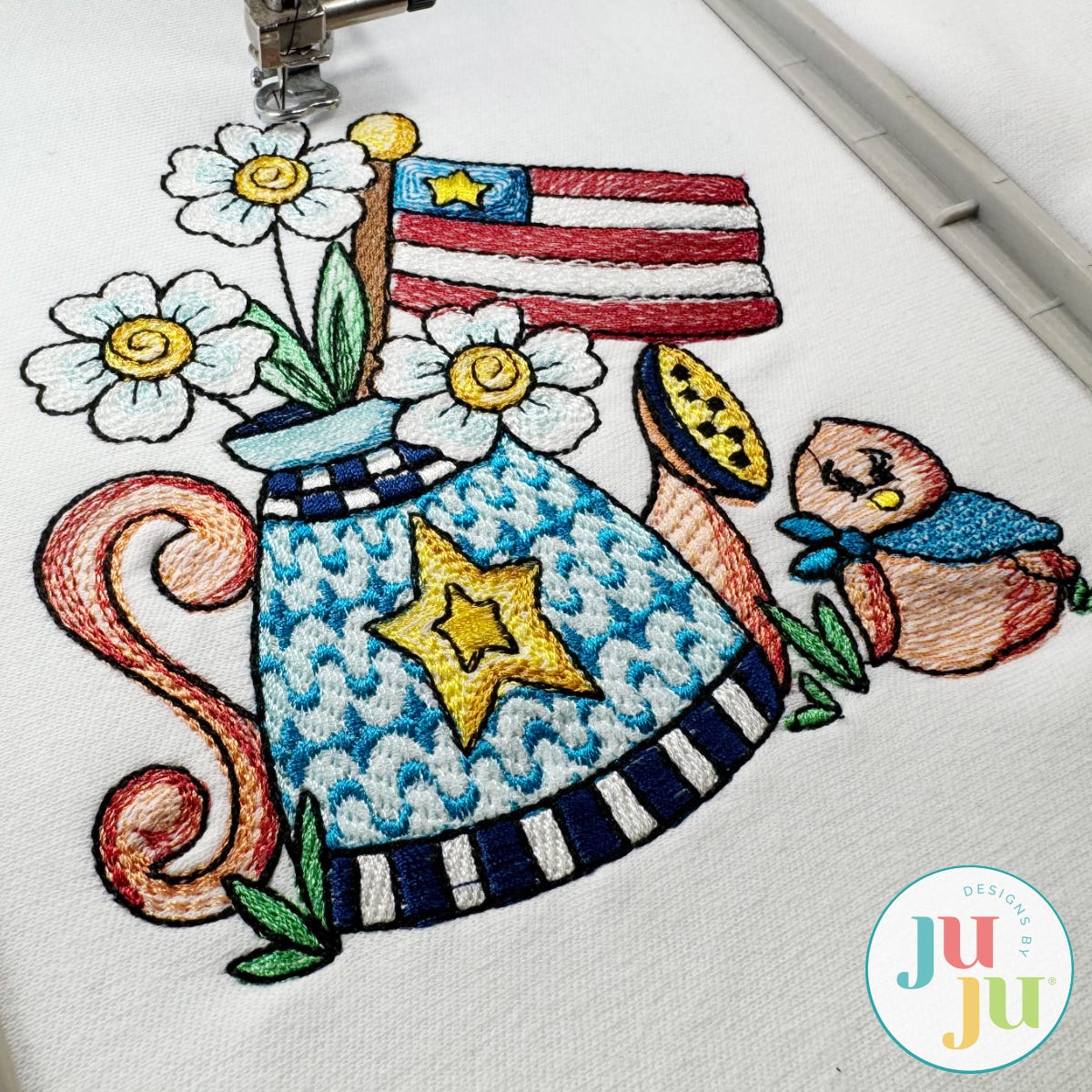 Bring some summer charm to your stitching with this Patriotic Scenes embroidery-only design! Featuring a classic Americana style watering can filled with blooming flowers and a waving flag, plus an adorable little bird by its side.