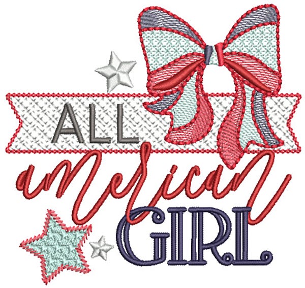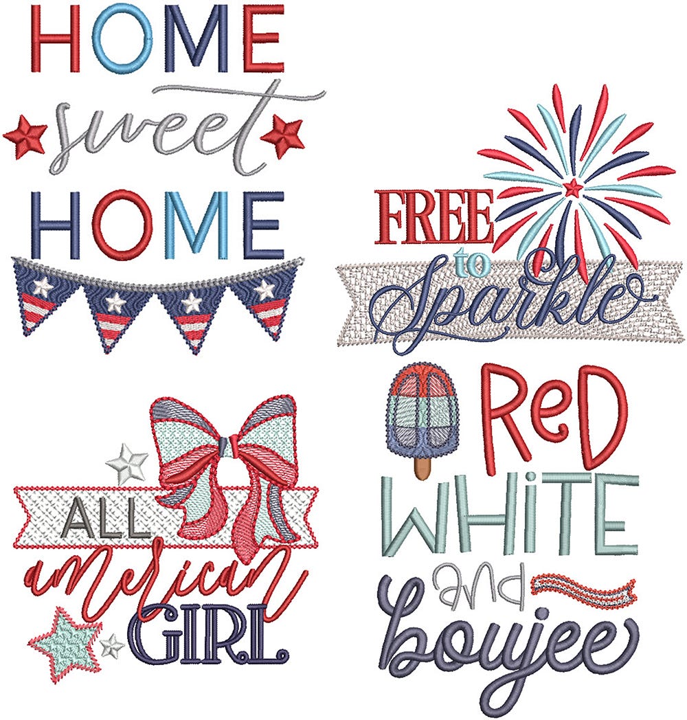 4 more cute patriotic word art designs featuring satin stitch lettering with a blend of sketch, motif and fill stitch design details.