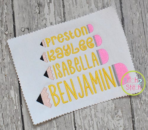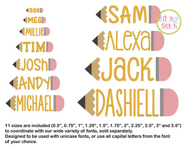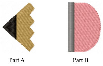 The Pencil Name Frame is made by combining two design files with the font of your choice (sold separately). Select a Pencil Tip (part A) and a Pencil Eraser (part B) in the same size as the font you want to use. In embroidery editing software use alignment tools to align the centers of the pencil parts and lettering.