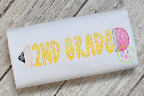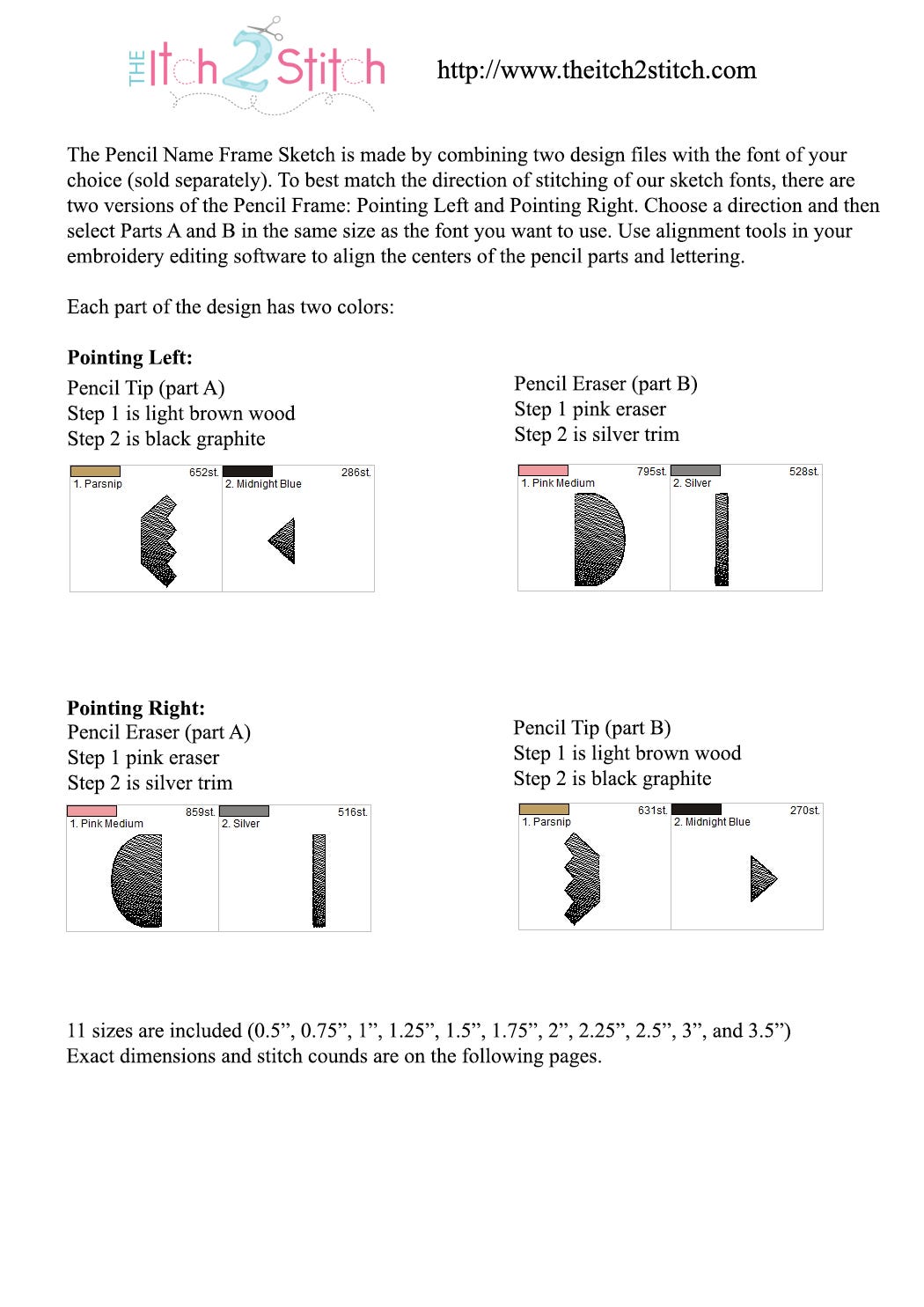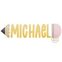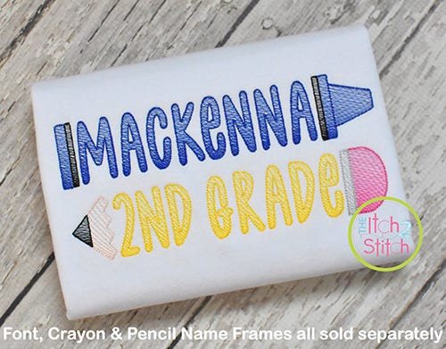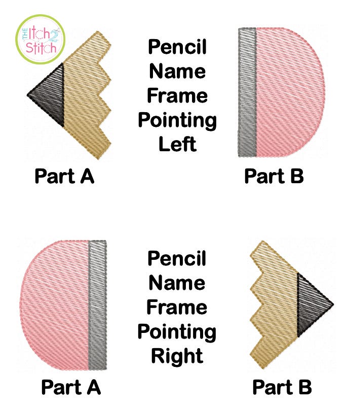 The Pencil Name Frame Sketch is made by combining two design files with the font of your choice (sold separately). To best match the direction of stitching of our sketch fonts, there are two versions of the Pencil Frame: Pointing Left and Pointing Right. Choose a direction and then select Parts A and B in the same size as the font you want to use. Use alignment tools in your embroidery editing software to align the centers of the pencil parts and lettering.