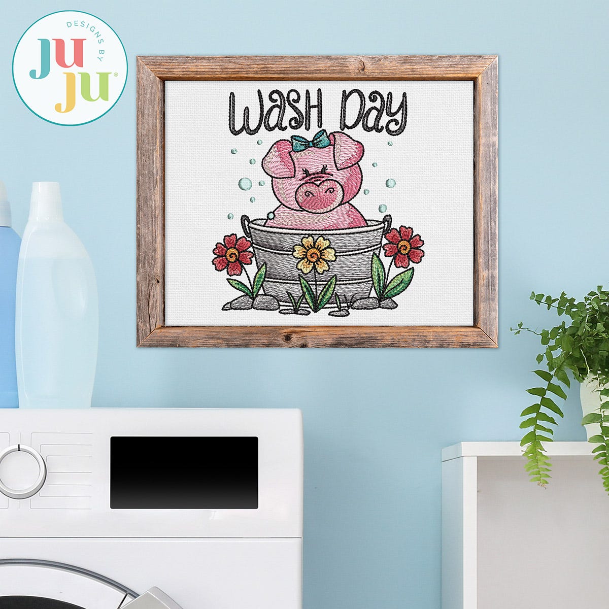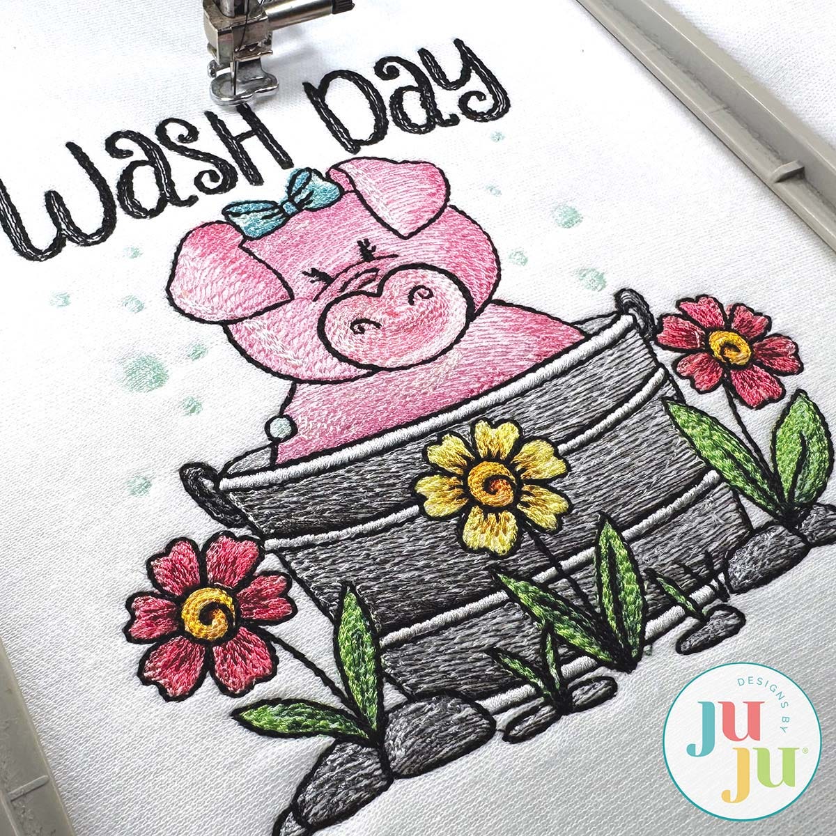 It's wash day for a sweet pig! This single design features multiple color layers of lighter density fill to create a blended, variegated, textured look. The text is included in the design as pictured. Four sizes included (4x4, 5x7, 6x10 and 8x8).