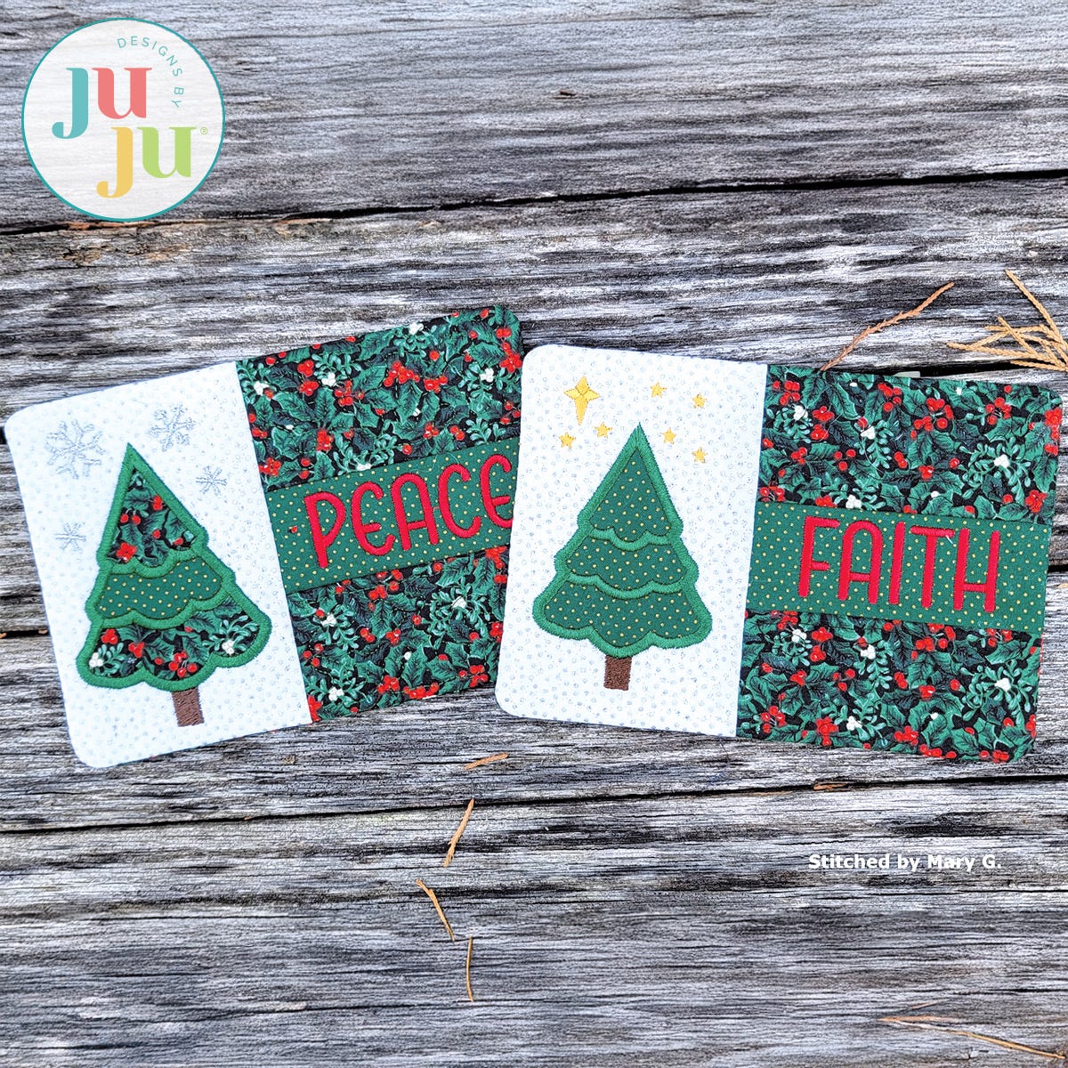 You will receive a total of 3 mug rug files: One with 'Peace', a tree & stars design, one with a blank space, tree & snowflake design and one with a blank space, tree & stars design. That way you can insert your own phrase or name in the blank space. The mug rug comes with detailed instructions (including photos) in pdf format.