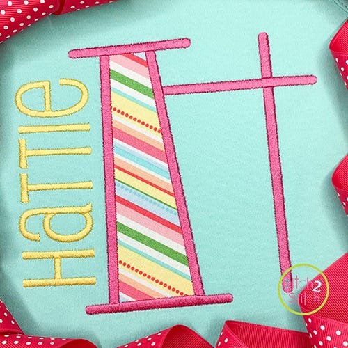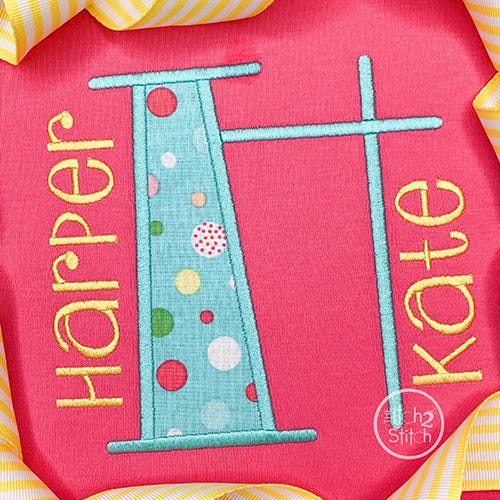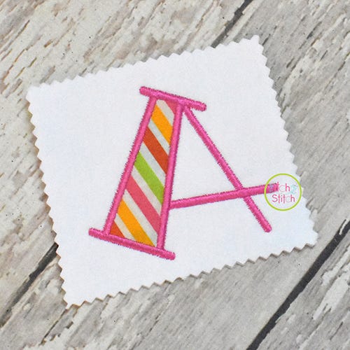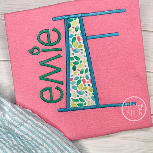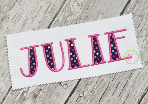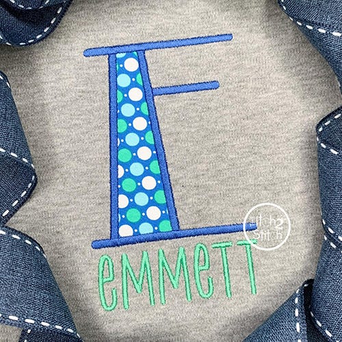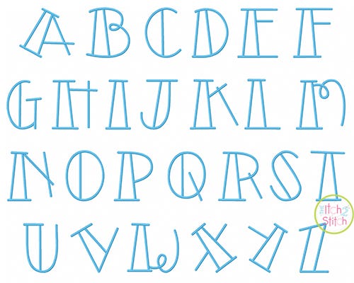 You will receive all A-Z letters (26 files) in six sizes (2", 3", 4", 5", 6", 7"). The font size is based on the capital O, and all letters are scaled accordingly. All letters in the 2" and 3" sizes fit in a 4x4 hoop. A larger hoop is needed for 4" size and above. Shown personalized with our Cutsie Joe, Copycat, Courtside, and Truly Madly Deeply fonts, sold separately.