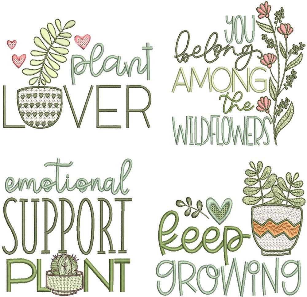 4 more beautiful and fun word art designs for plant lovers! These designs are embroidery-only featuring satin stitch lettering with motif and sketch fill design details.