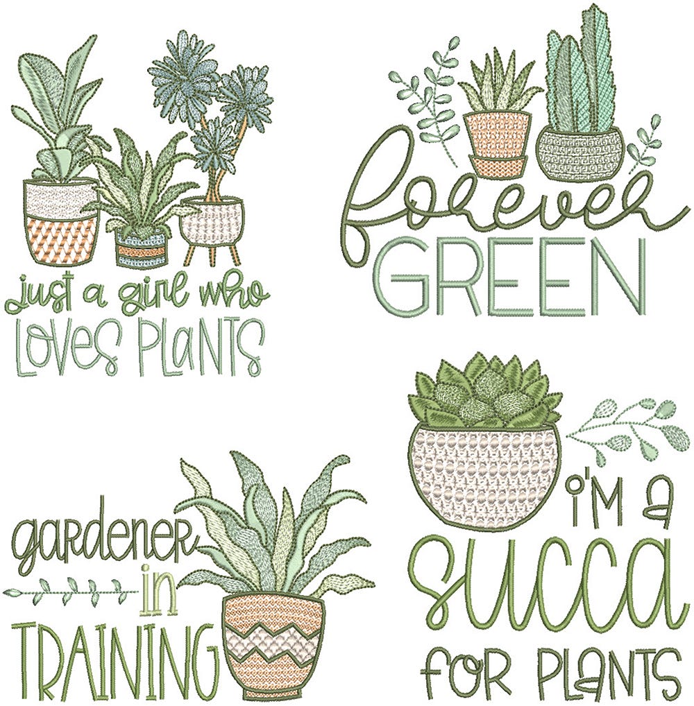 4 more beautiful and fun word art designs for plant lovers! These designs are embroidery-only featuring satin stitch lettering with motif and sketch fill design details.