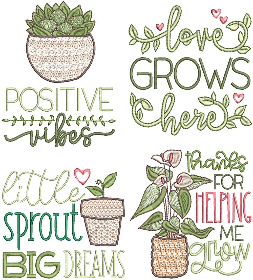 4 more beautiful and fun word art designs for plant lovers! These designs are embroidery-only featuring satin stitch lettering with motif and sketch fill design details.