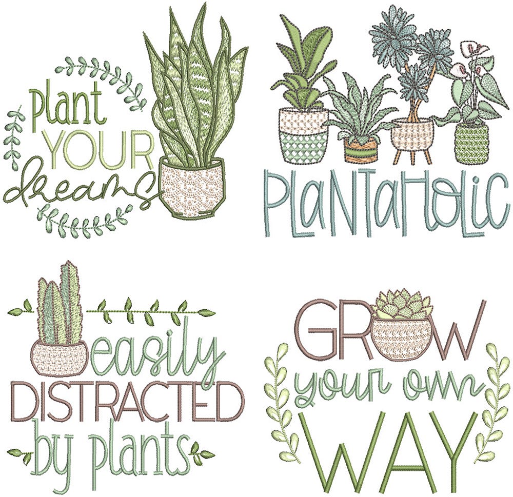 4 more beautiful and fun word art designs for plant lovers! These designs are embroidery-only featuring satin stitch lettering with motif and sketch fill design details.