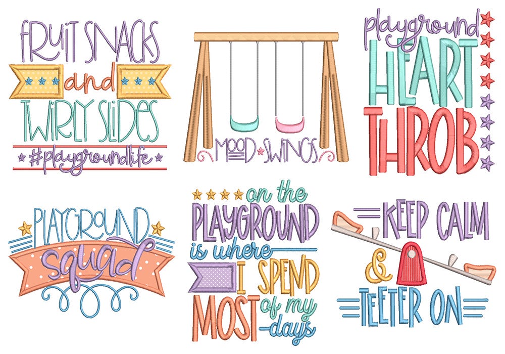 *Please note that the following designs contain applique components: Fruit snacks and twirly slides #playgroundlife / Playground squad / On the playground is where I spend most of my days / Keep calm and teeter on /