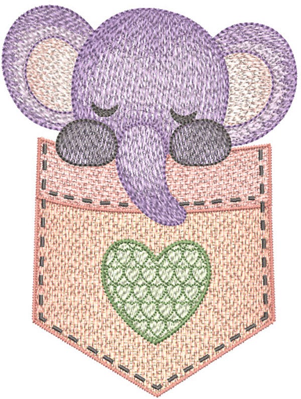 An adorable Pocket Elephant design featuring multiple color layers of lighter density fill to create a blended, variegated, textured look. 4x4 and 5x7 hoop sizes included.