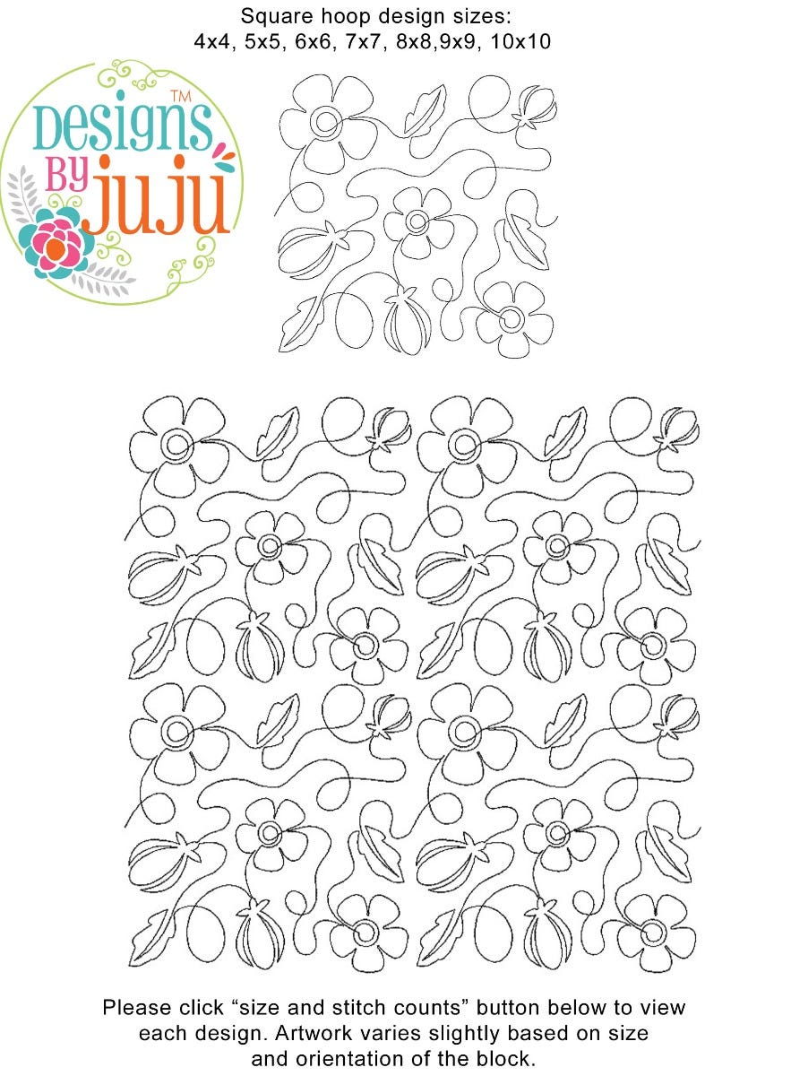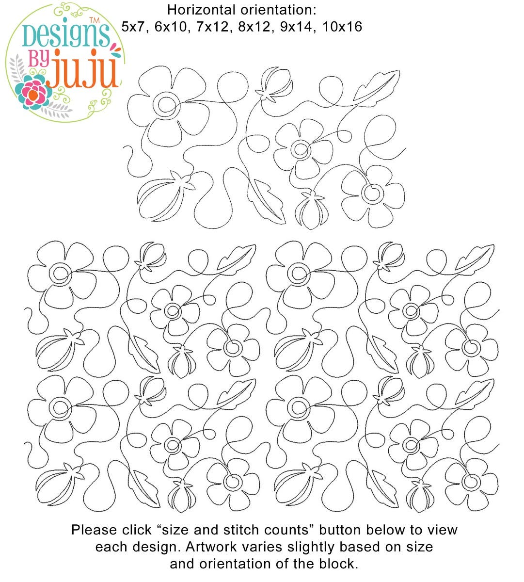Each one of our End-to-End Quilting™ embroidery designs is an originally created design available in a large variety of block sizes. Every block is one continuous single-run line running edge to edge beginning on the left and exiting on the right. There is NO backtracking or double stitching. Each size block has been engineered and manually digitized by our team for EXACT edge-to-edge quilting precision so that when they are aligned properly in your hoop, you cannot tell where one block ends and the next one begins! ADDITIONALLY, the art has been created for each size so that when the rows are stacked on top of each other, it provides a practically seamless, professional, allover quilting effect that mimics (E2E) pantographs so you can do edge-to-edge quilting on your embroidery machine!