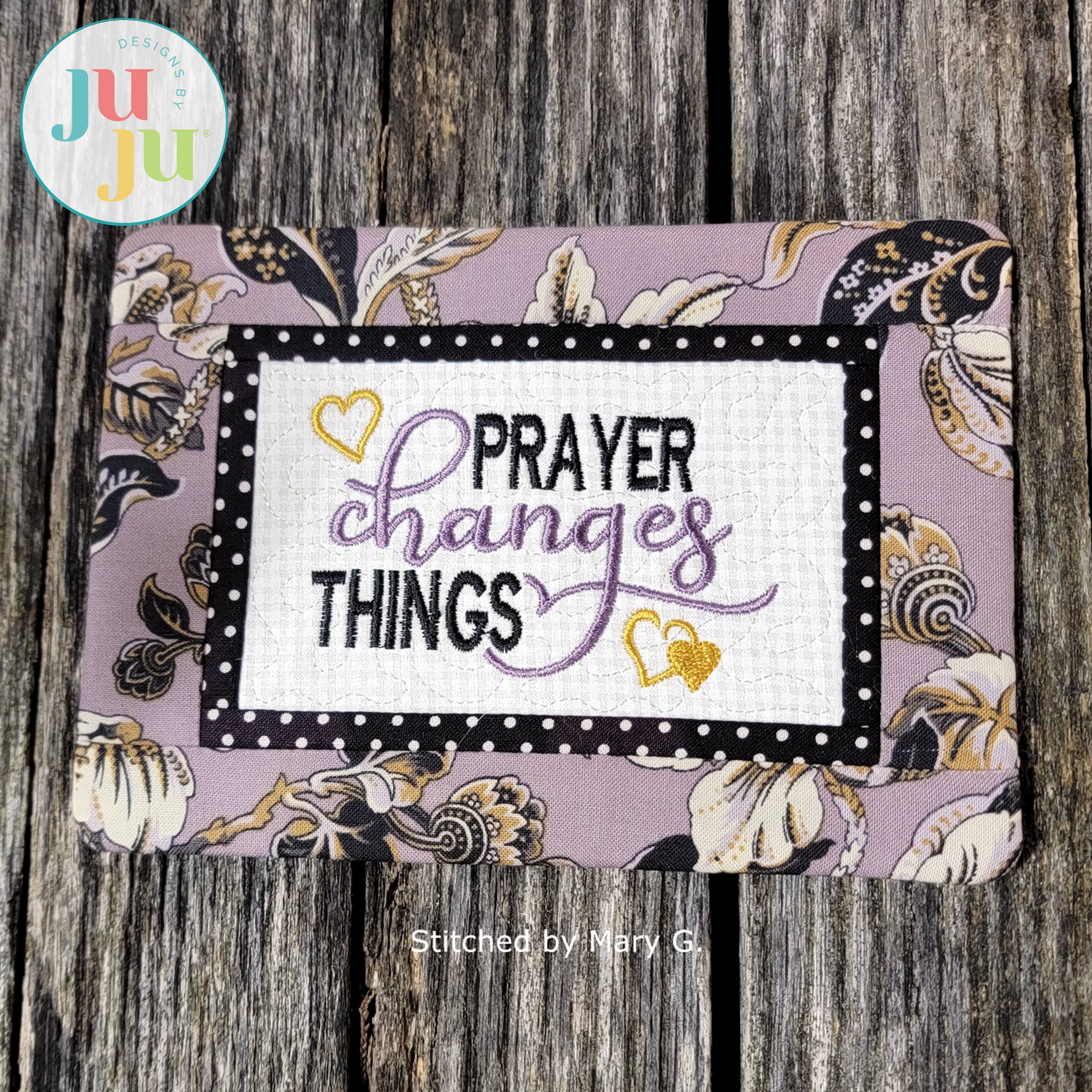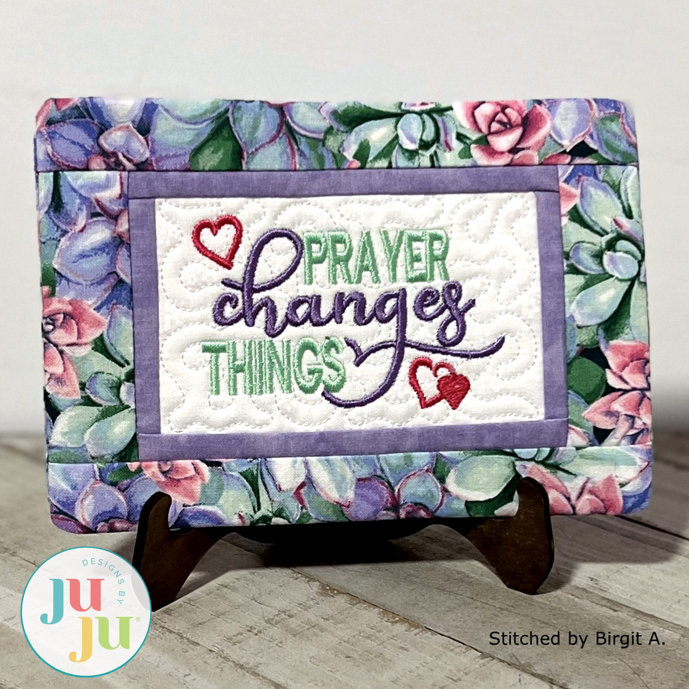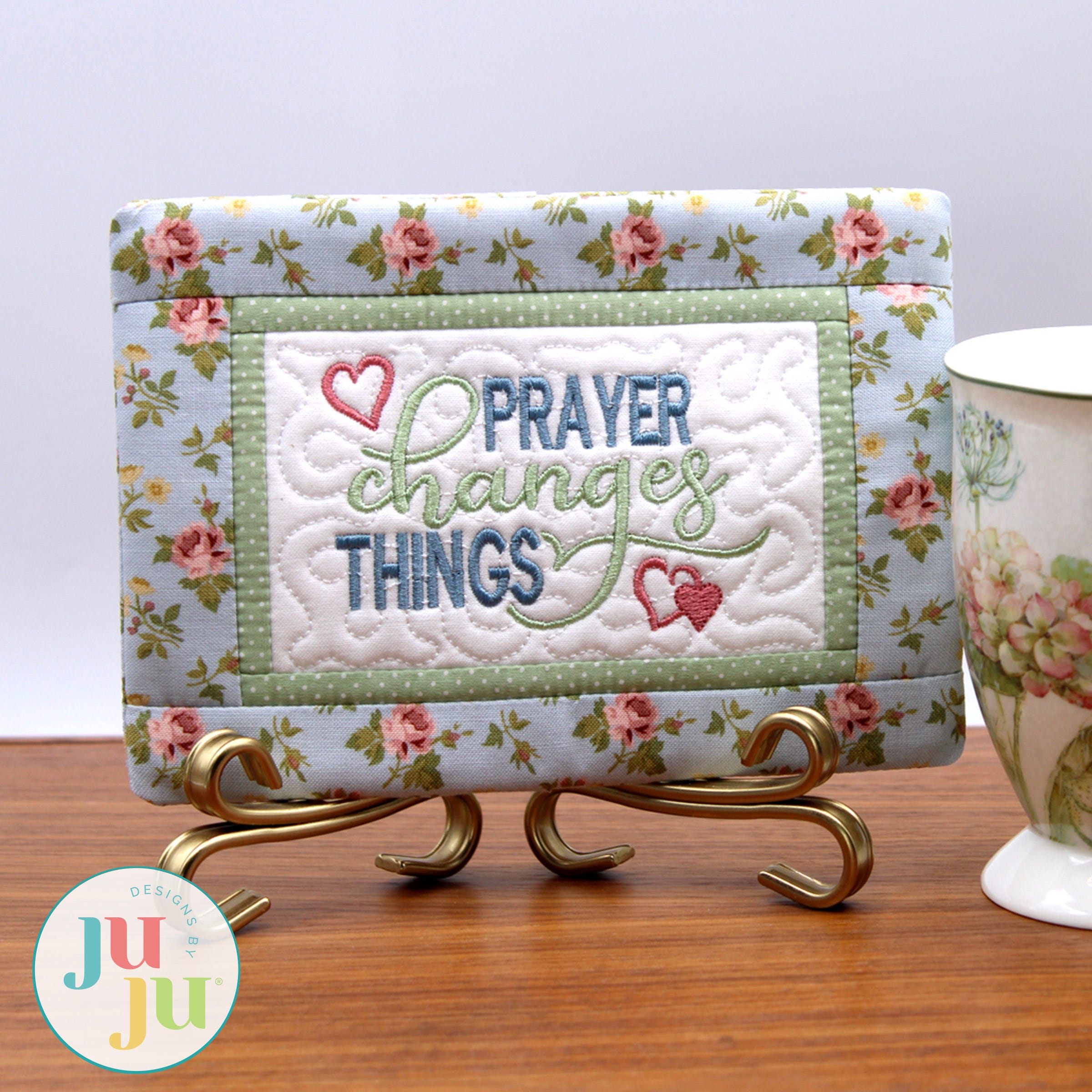 This inspirational mug rug is completely stitched in the hoop; no additional hand or sewing machine stitching required. The inner and outer side borders are attached during the embroidery process. The background is lightly quilted. Use it as a true mug rug or as a home decor displayed on a small easel.