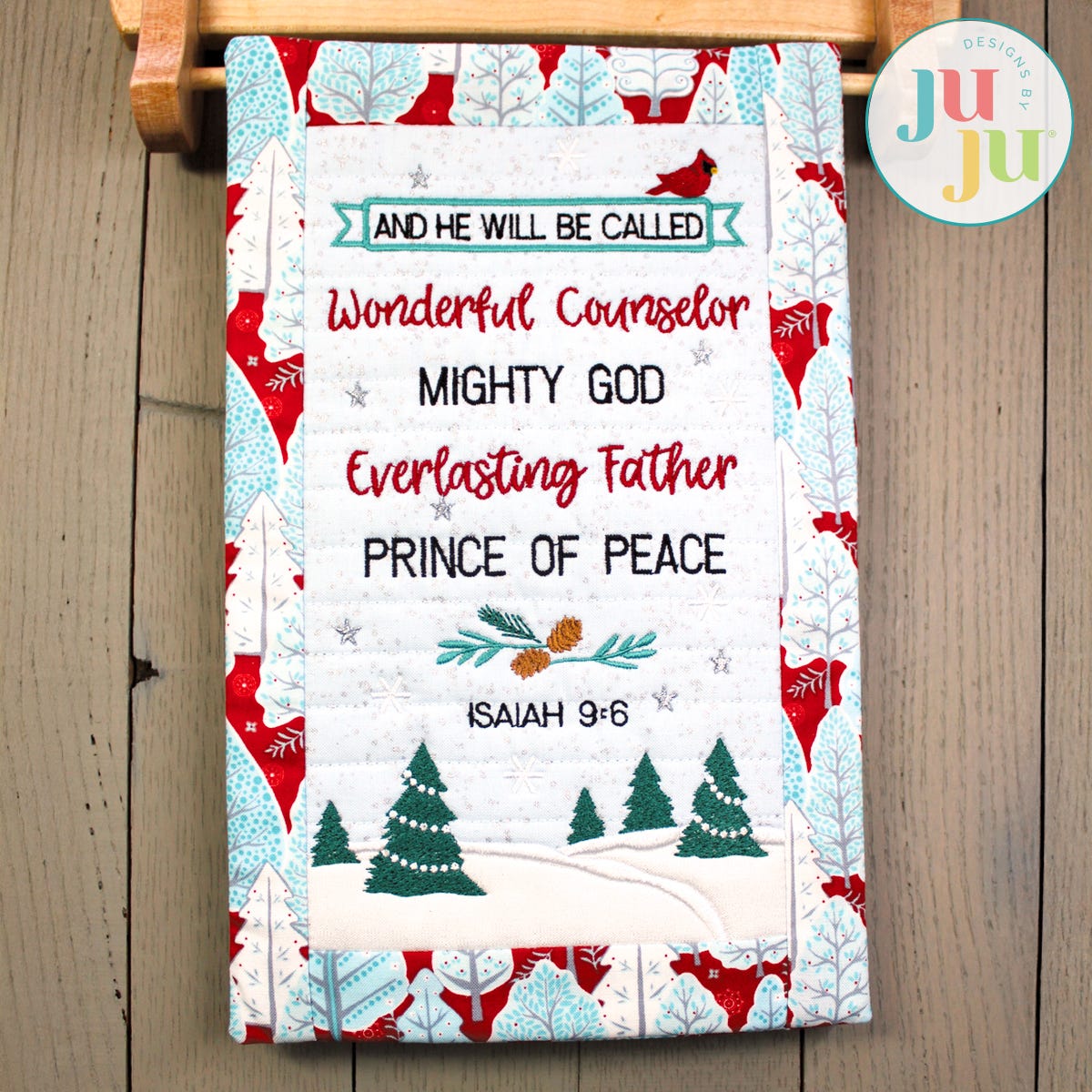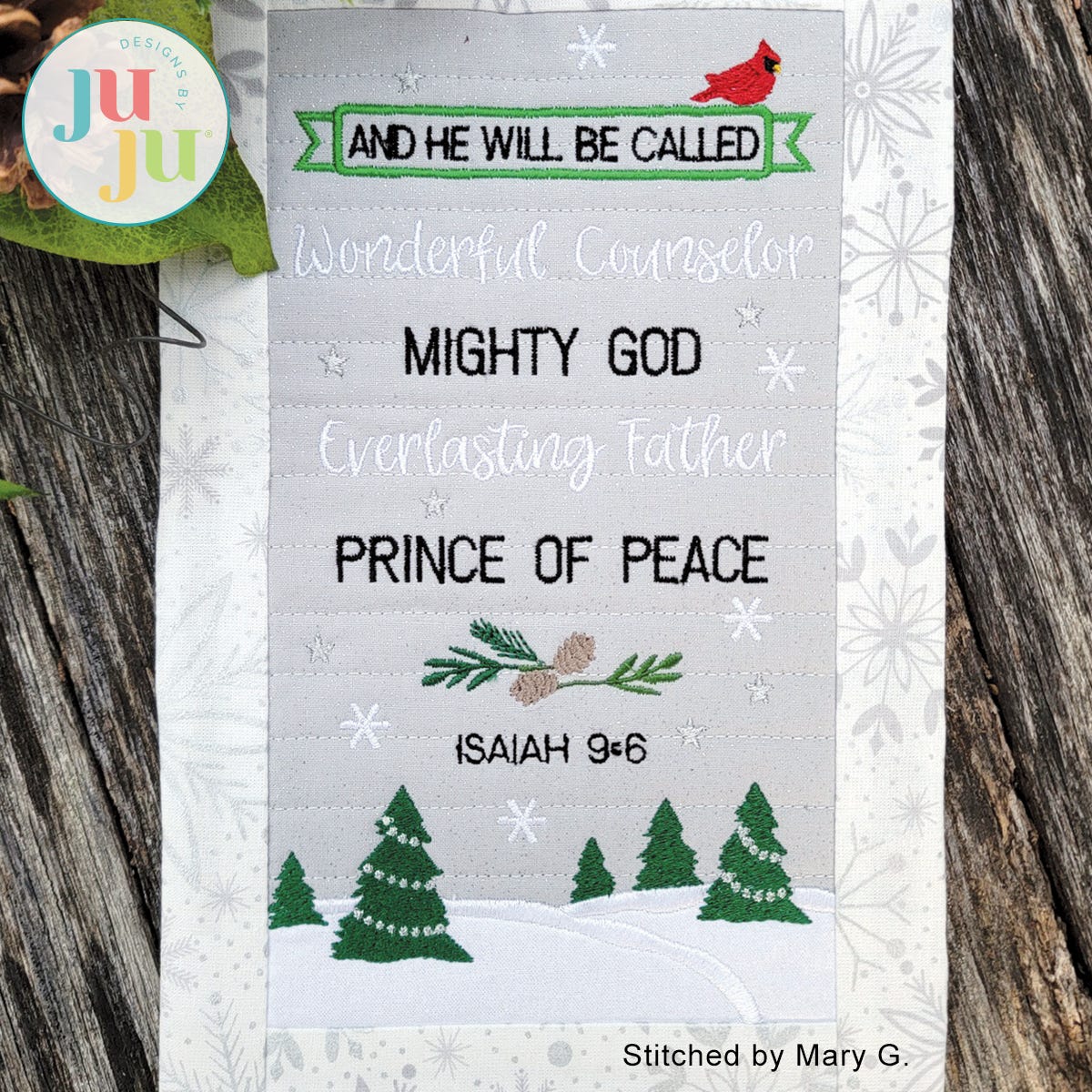 Decorate your home with this inspirational Christmas mini quilt. It is entirely made in the hoop. No additonal hand or sewing machine stitching required. The background of the mini quilt is lightly quilted in the hoop. The borders as well as a sleeve for hanging the mini quilt get attached during the embroidery process. The lower "snow" edge is appliqued. The design comes with thorough instructions in pdf format with many photos.