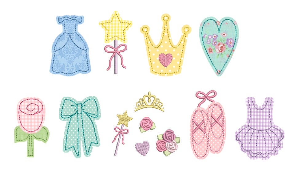 Princess Kit includes eight appliques (Ballet Slippers, Bow, Dress, Heart, Rose, Tiara, Tutu, Wand) and five embroidery-only accents (Mini Heart, Mini Rose, Mini Rose Cluster, Mini Tiara, Mini Wand).