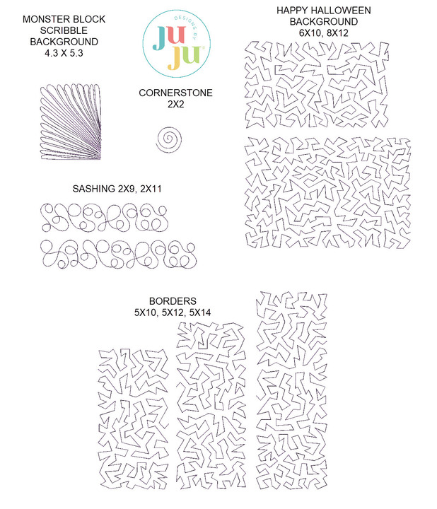 Digital designs for the applique pieces are NOT included with this background quilting set. This set includes background quilting for: each monster block, Happy Halloween words block, sashing, cornerstones, and the outer border.