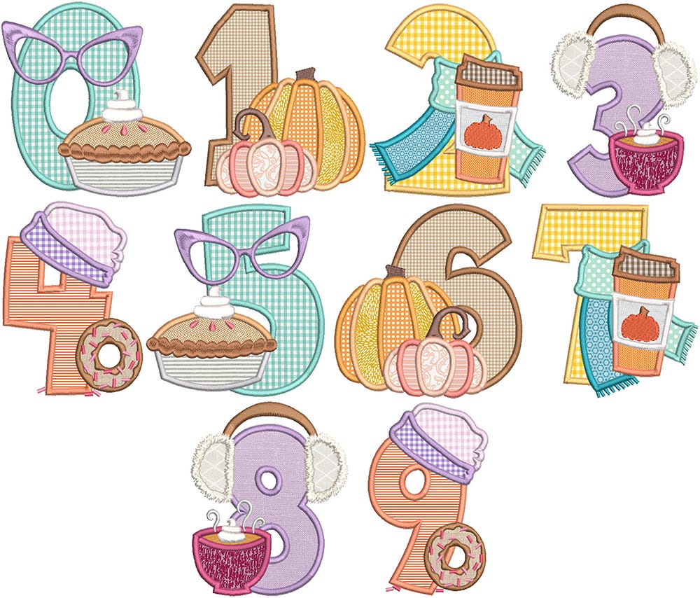 Donuts, Pies and Lattes take center stage in our Pumpkin Spice Applique Numbers The applique numbers have a satin stitch outline and include applique pumpkin-themed elements.