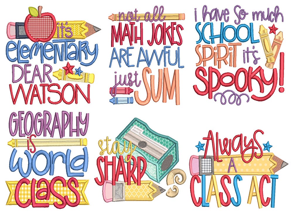 *Please note that the following designs contain applique components:Ā It's elementary dear Watson / Geography is world class / Stay sharp / Always a class act Ā