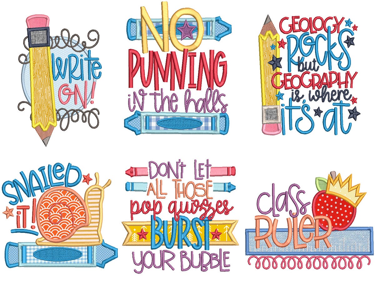 *Please note that the following designs contain applique components:Ā Write on! / No Punning in the halls / Geology rocks but geography is where it's at / Snailed it! Don't let all those pop quizzes burst your bubble / Class rulerĀ
