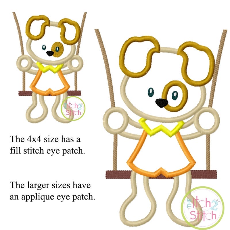 The 4x4 size has fill stitch eye patch, the larger sizes have applique eye patch.